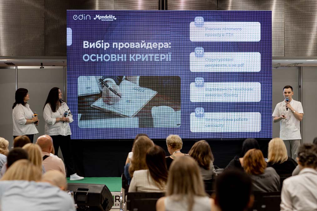 The joint presentation was made by Dmytro Honcharov, EDIN Product Manager, Nataliia Mishchenko, Chief Accountant of METRO Ukraine, and Yuliia Avramenko, International and Local Transport Specialist at Mondelez Ukraine. They spoke about the realities of implementing e-CMR for business.