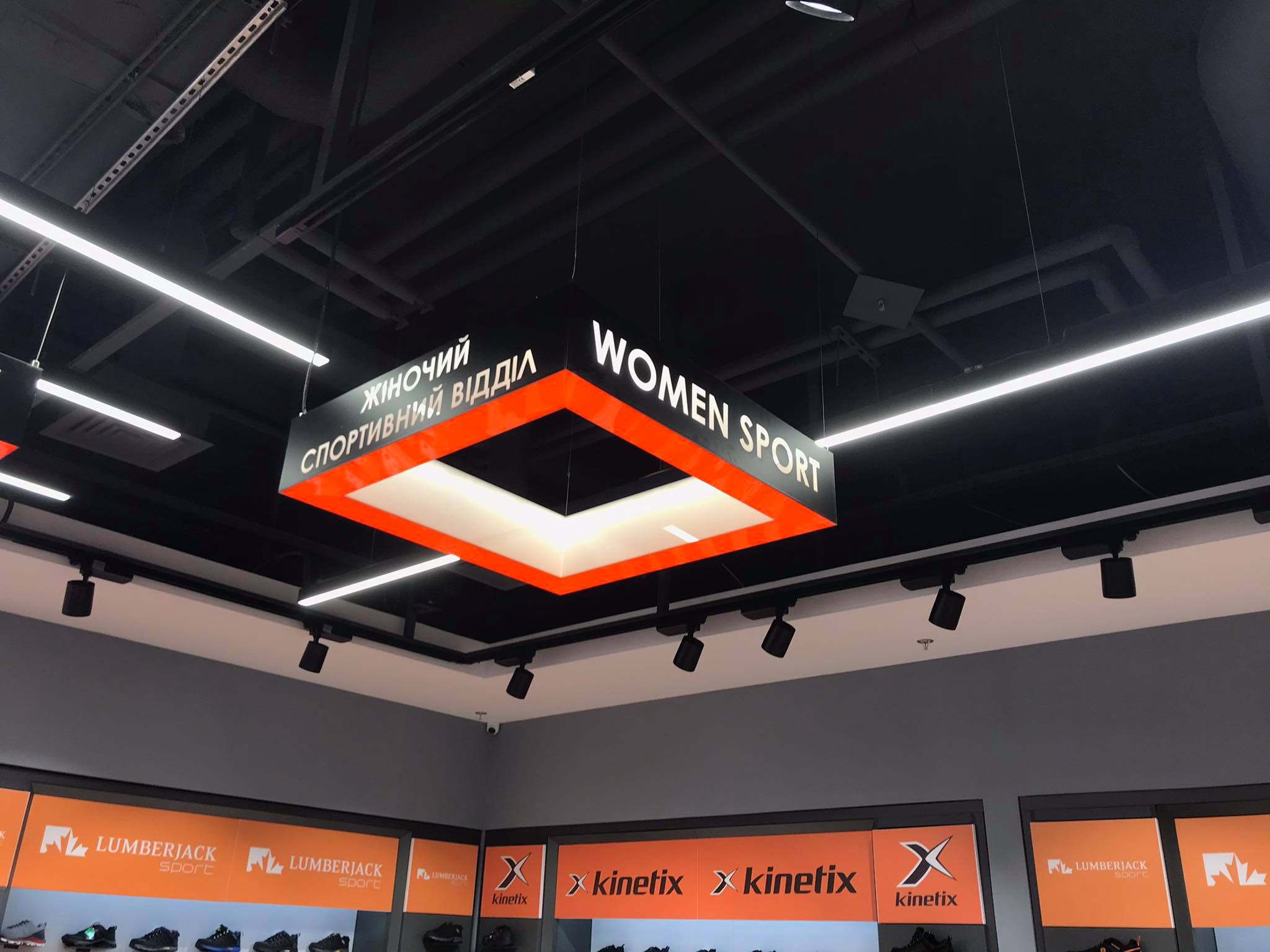 This is a bright store with an area of 420 sq. m., with a convenient display of products and their segmentation for different audiences of customers: women’s and women’s sports, men’s and men’s sports, as well as children’s departments. The store pays great attention to the safety. On the information posters there is an appeal to customers with a request to try on shoes for one person in special areas where comfortable poufs and chairs are placed. Useful consumer information and description of the designated symbols regarding what material shoes are made of are published on a special stand.