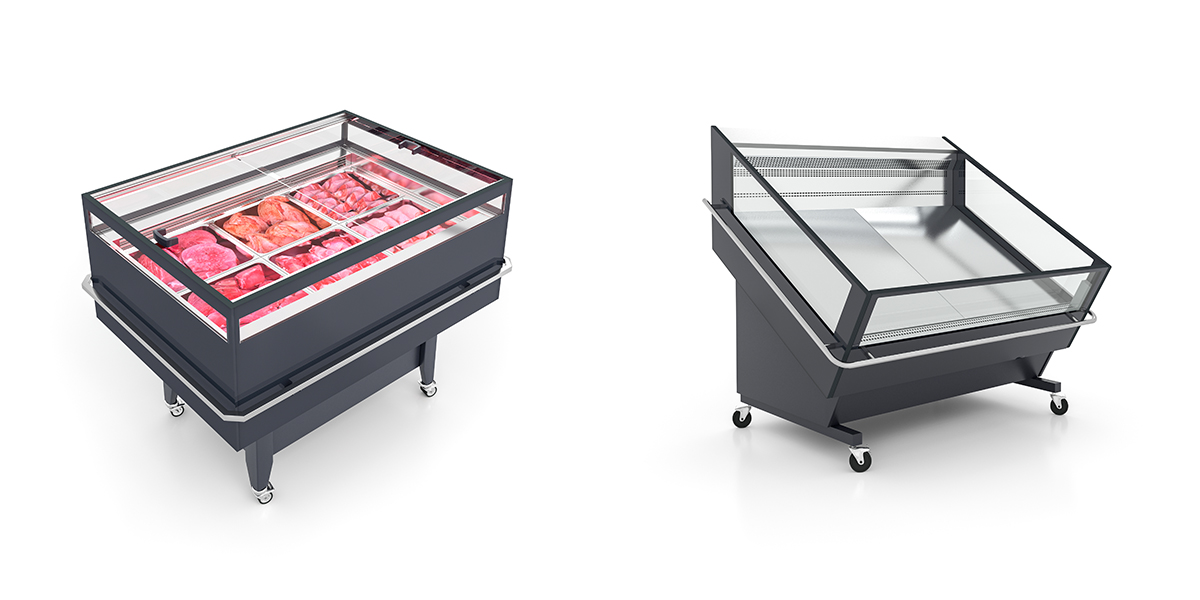 Promo Meat refrigerated display case for self-service meat sales (developed for Tavria V) and Promo FV refrigerated display case for vegetables and fruits (developed for Daas, Romania)