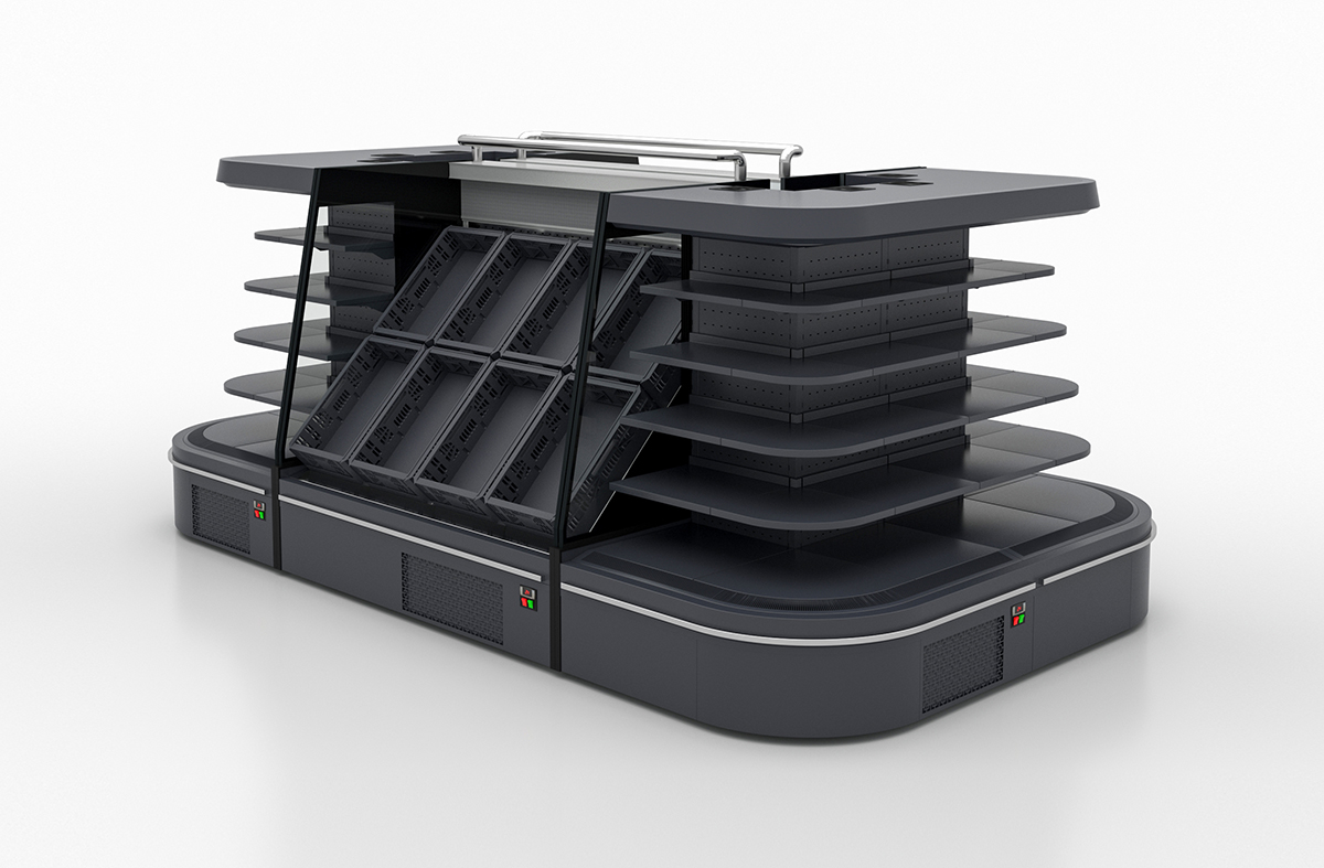 Comfort Diagonal refrigerated island with built-in low-temperature combined display case and column-bypass module – developed for Velmart