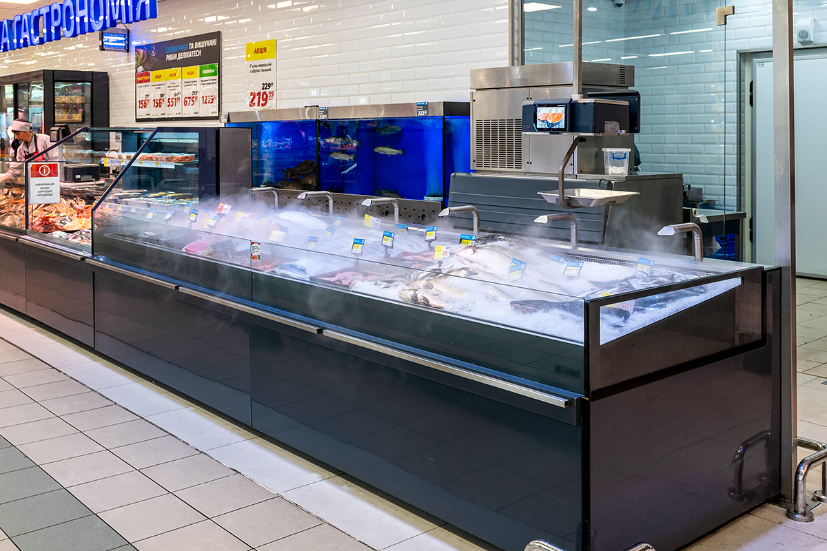Panoramic refrigerated display cases with transparent rear walls – developed for a city seafood shop