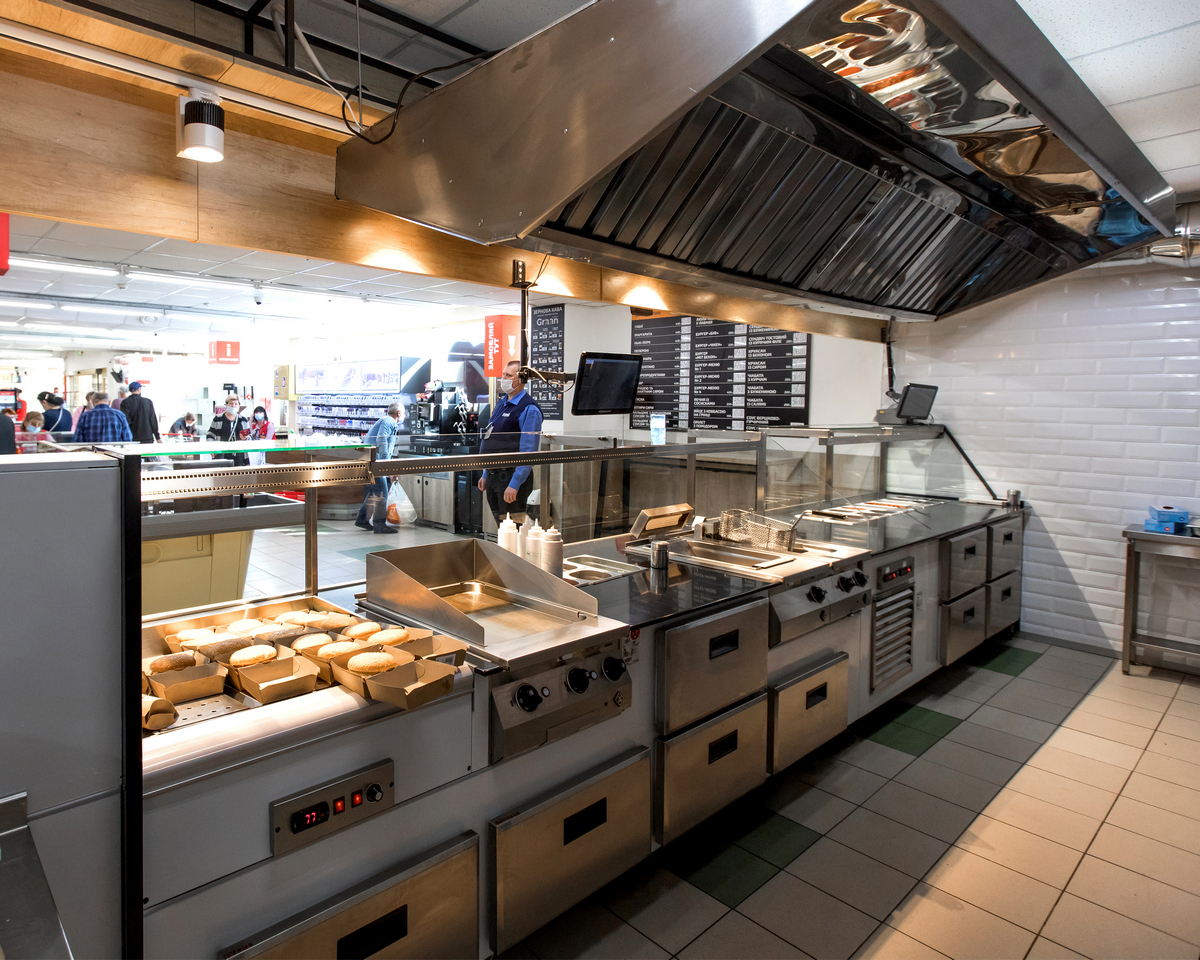 Nowadays, many stores organize fresh food production. And not only for direct sales in trade departments where technological equipment is integrated into the sales line. One of today’s trends is small cafés inside supermarkets and shopping centers. For this, we produce special complete equipment lines, always customized, though they may consist of already developed modules. The individuality of such lines depends on the café’s menu. Since no two menus are alike, the lines also have their own unique features.