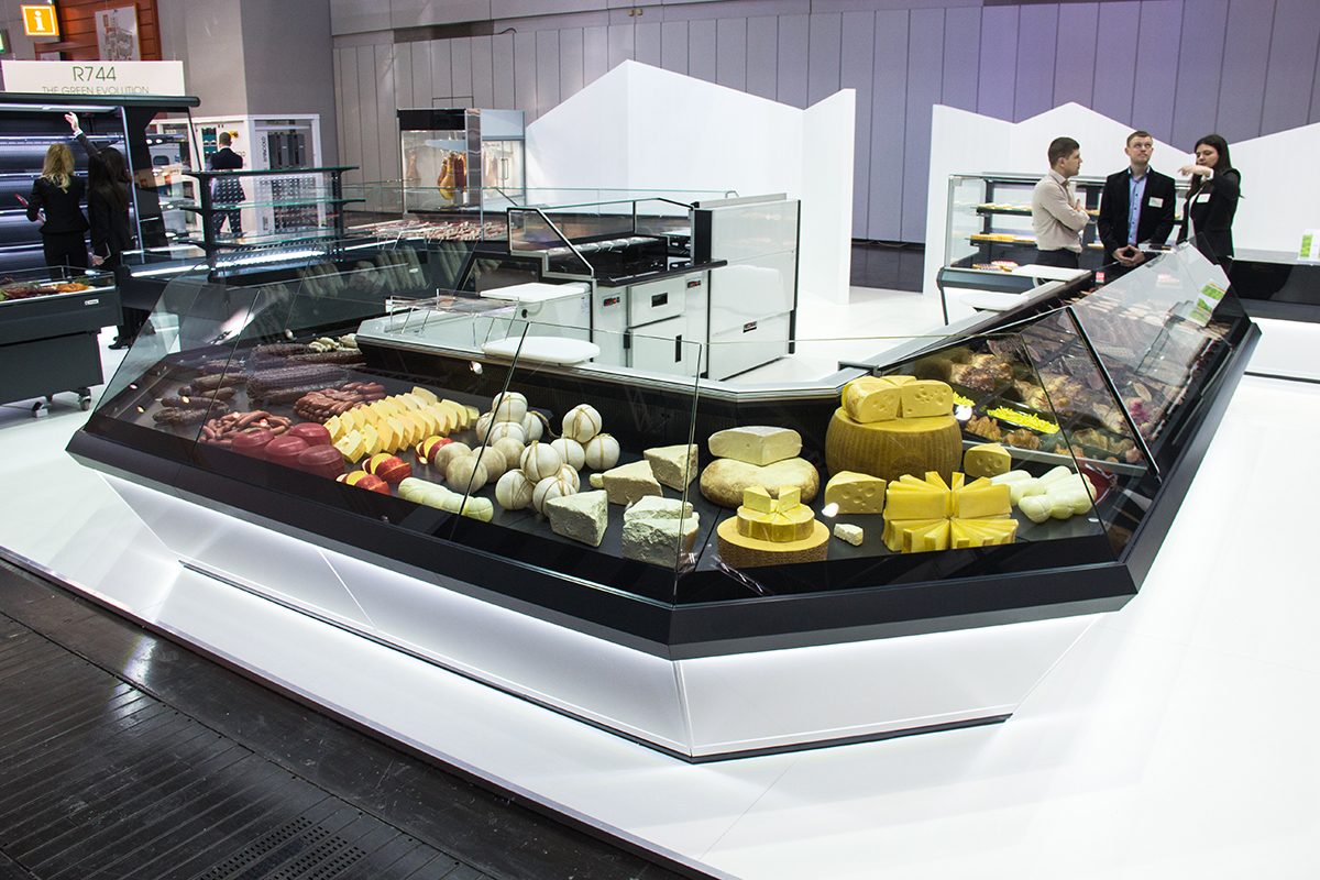 Refrigerated display cases in Diagonal design at EuroShop-2017, Germany