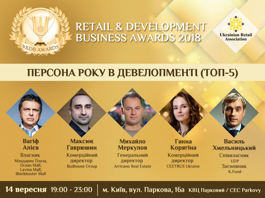 The rewarding solemn ceremony the best retailers and developers for the Retail & Development Business Awards-2018 will be held on September, 14 in Kiev, in the CEC Parkovyi, from 19 to 23.