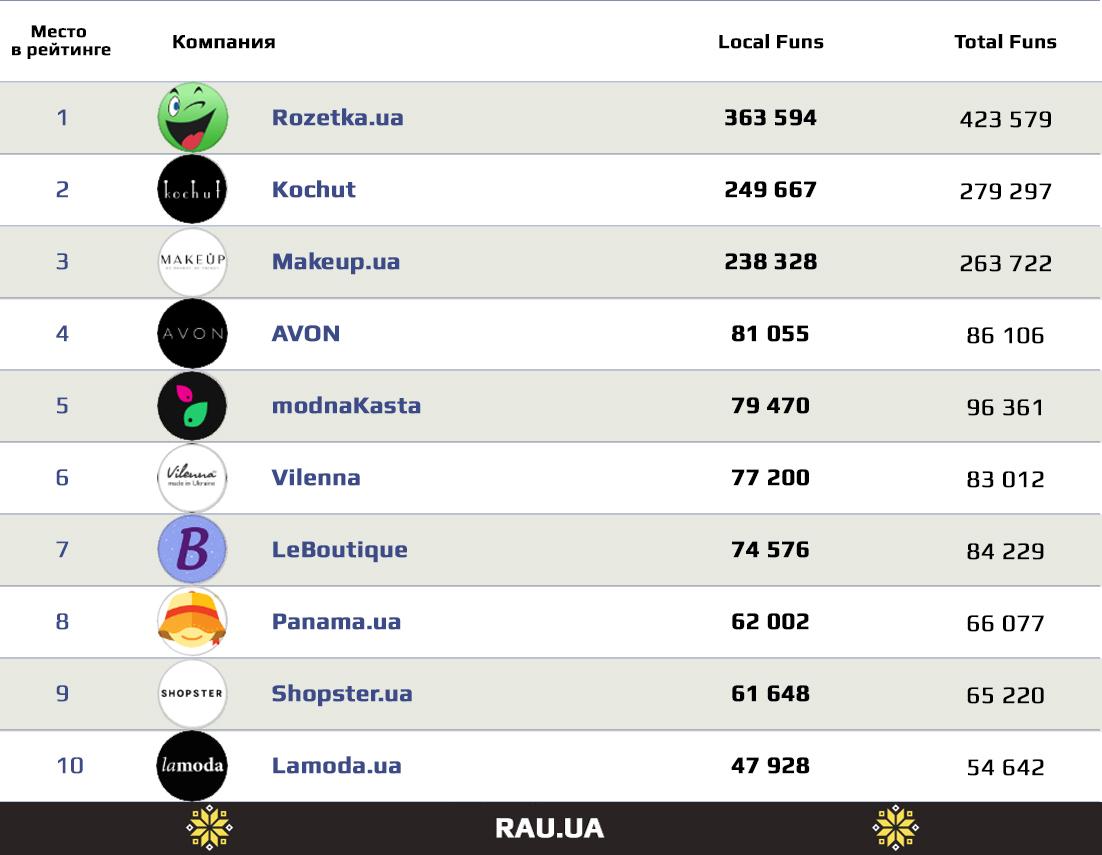Картина серед торгових майданчиків, які працюють онлайн, в цілому продовжила тенденцію рітейлерів. Перша трійка в особі Rozetka.ua, ювелірів Kochut, а також Make.ua, підросла на 2-3 тисячі фоловерів. Слідуюча за ними не менш різношерста трійка – AVON, modnaCasta і Vilenna – роздобули всього по 1000 нових фанів. А от у випадку LeBoutique, який зайняв сьоме місце рейтингу, навіть про такий мінімальний успіх говорити не доводиться – менше 400 нових фанів. Такий результат для гіганта з більш, ніж 70 000 підпісників – взагалі не результат.