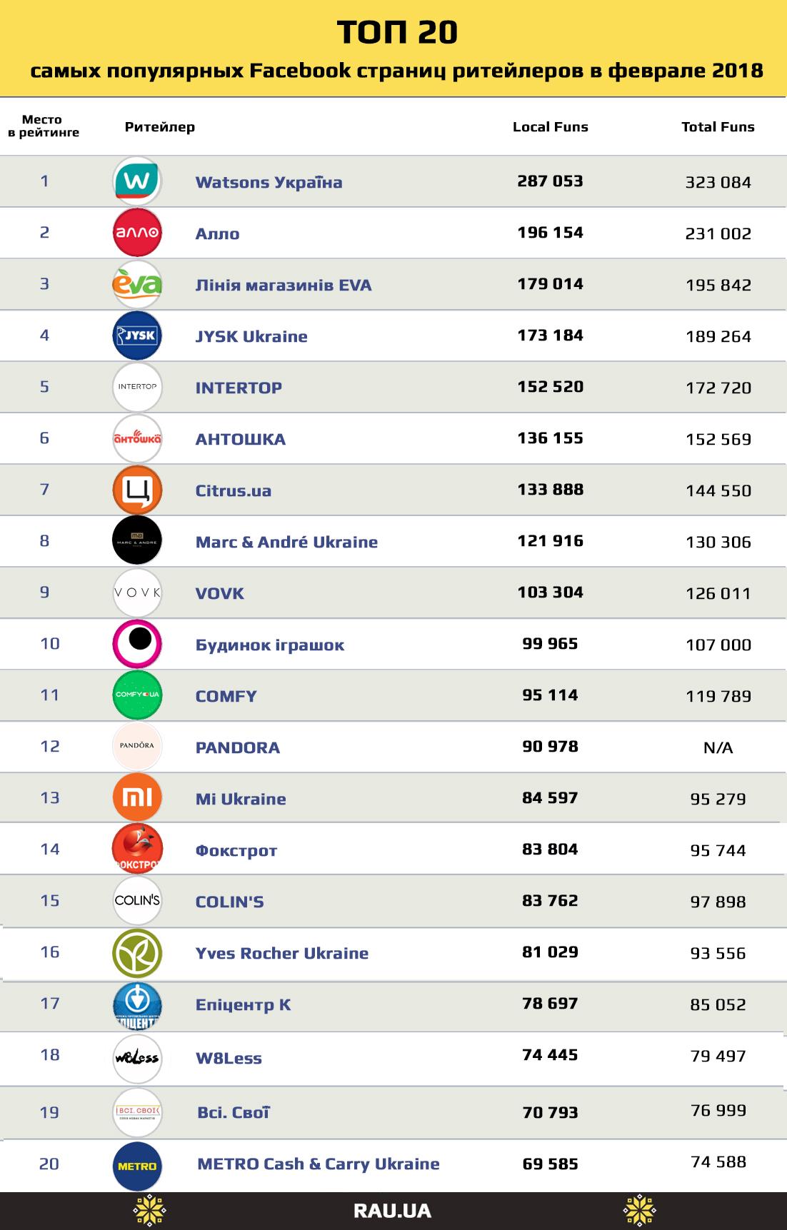 Топ-20 Facebook-сторінок українських рітейлерів і ТРЦ за лютий