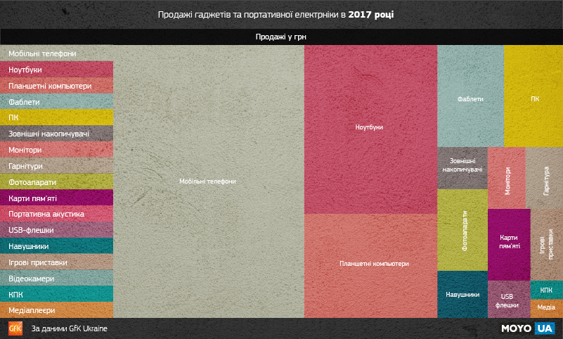 Сумарно на телефони, планшети і ноутбуки за минулий рік українці витратили понад 30 млрд грн. Тоді як на всю іншу персональну техніку і аксесуари – близько 9 млрд грн.