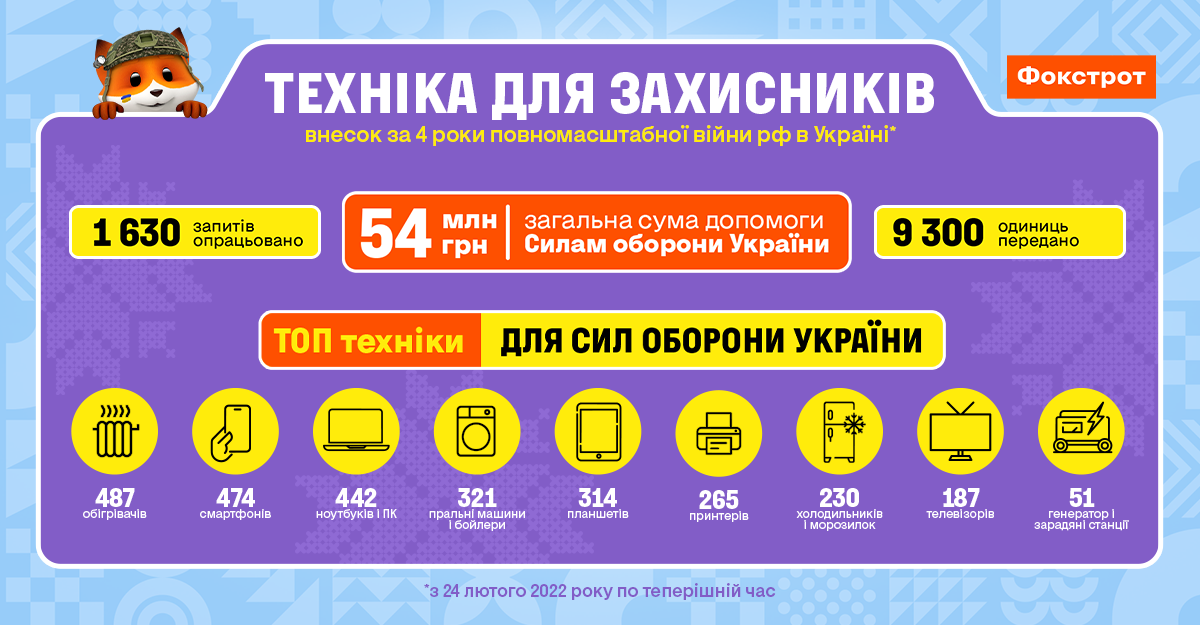 До четвертої річниці повномасштабного вторгнення рф Фокстрот підбив підсумки роботи, спрямованої на підтримку захисників. Станом на 24 лютого 2026 року компанія передала Силам оборони України техніки на 54 млн грн. За цей час опрацьовано 1630 запитів від військових підрозділів і передано понад 9300 одиниць цифрової та побутової техніки.