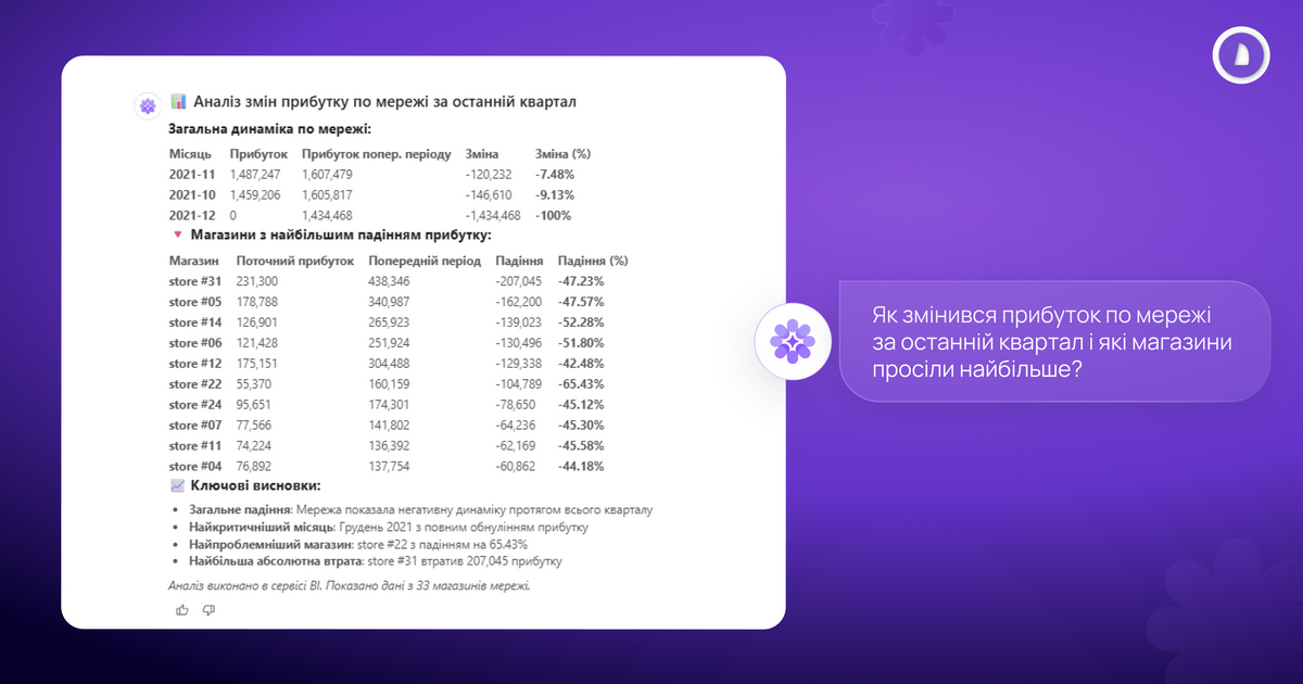 «Як змінився прибуток по мережі за останній квартал і які магазини просіли найбільше?»