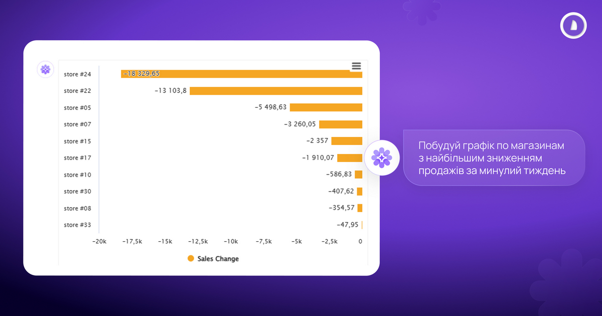 «Побудуй графік по магазинам з найбільшим зниженням продажів за минулий тиждень»
