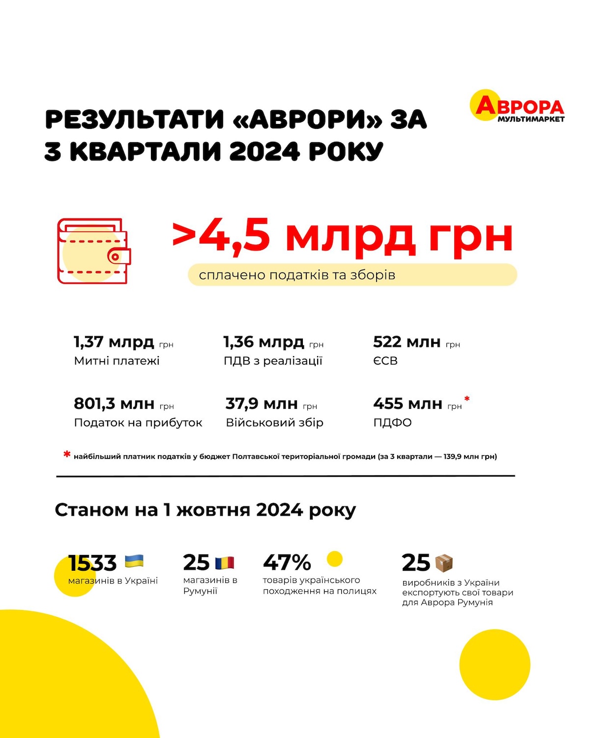 Із загальної суми сплачених податків 1,37 млрд грн склали митні платежі, 1,36 млрд грн – ПДВ із реалізації, 522 млн грн – єдиний соціальний внесок, 803,1 млн грн – податок на прибуток, 37,9 млн грн – військовий збір. За результатами трьох кварталів 2024 року мережа Аврора є найбільшим платником податків у Полтавській територіальній громаді – 139,9 млн грн.