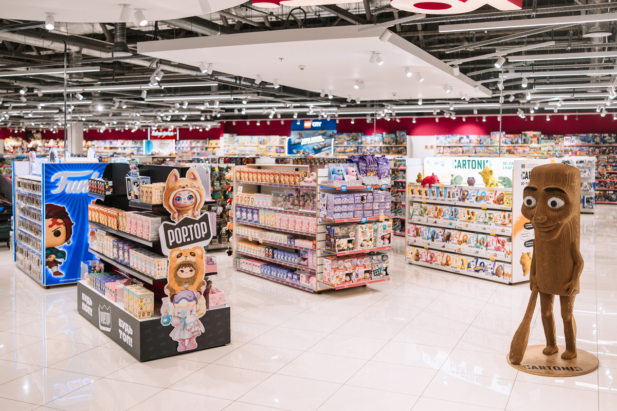 Загальна площа магазину 1161 кв. м. Простір отримав оновлений дизайн та низку інтерактивних зон: великий острів із бізібордами, геймінг-зону з PlayStation, трек Hot Wheels, зону для гри з Barbie, тематичні фотозони та інсталяції з фігурками популярних персонажів.