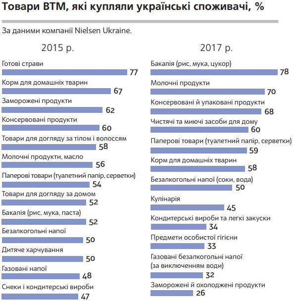 Взагалі серед товарів ВТМ, які купують українські споживачі, лідирують бакалія, молочні, консервовані продукти харчування, миючі засоби тощо.