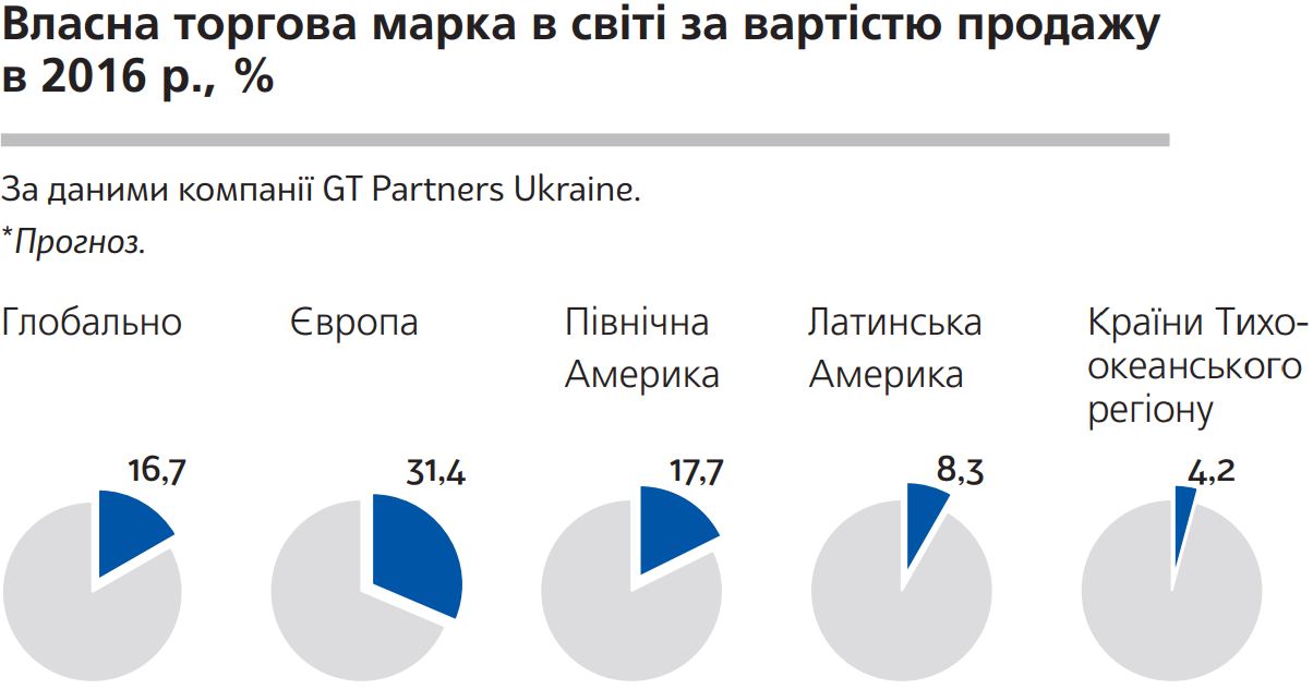 Як пише портал Business.ua, на відміну від інших країн, в Україні власні торгові марки (ВТМ, private label) ще не користуються великою популярністю у покупців. За даними компанії Nielsen, торік в грошовому вираженні їх частка в деяких категоріях складала 11,7%. Тоді як, наприклад, в Європі у 2016 році частка private label склала 31,4% і постійно зростає. За даними аналітиків, ситуація, схожа до української, спостерігається в країнах Латинської та Північної Америки і в країнах Тихоокеанського регіону, де частка ВТМ поки нижче за 20%.