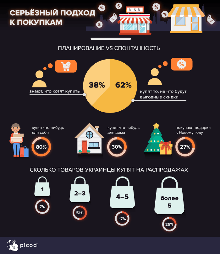 На Заході “Чорна п’ятниця” є дуже доречною для споживача: саме в кінці листопада багато людей планують знайти на полицях магазинів подарунки до Різдва за зниженими цінами. Аналітики Picodi також попросили українців відзначити, заради чого вони вирішуються на шопінг в найбільш «гарячий» день в році та кому призначені покупки. 27% опитаних зізналися, що, зокрема, купують подарунки до різдвяних і новорічних свят. Мабуть, небагато українців замислюються про подарунки в листопаді, а передсвяткова метушня починається тільки в грудні. Під час акції Black Friday покупці в основному купують що-небудь для себе (80%) або новинку для дому (30%).