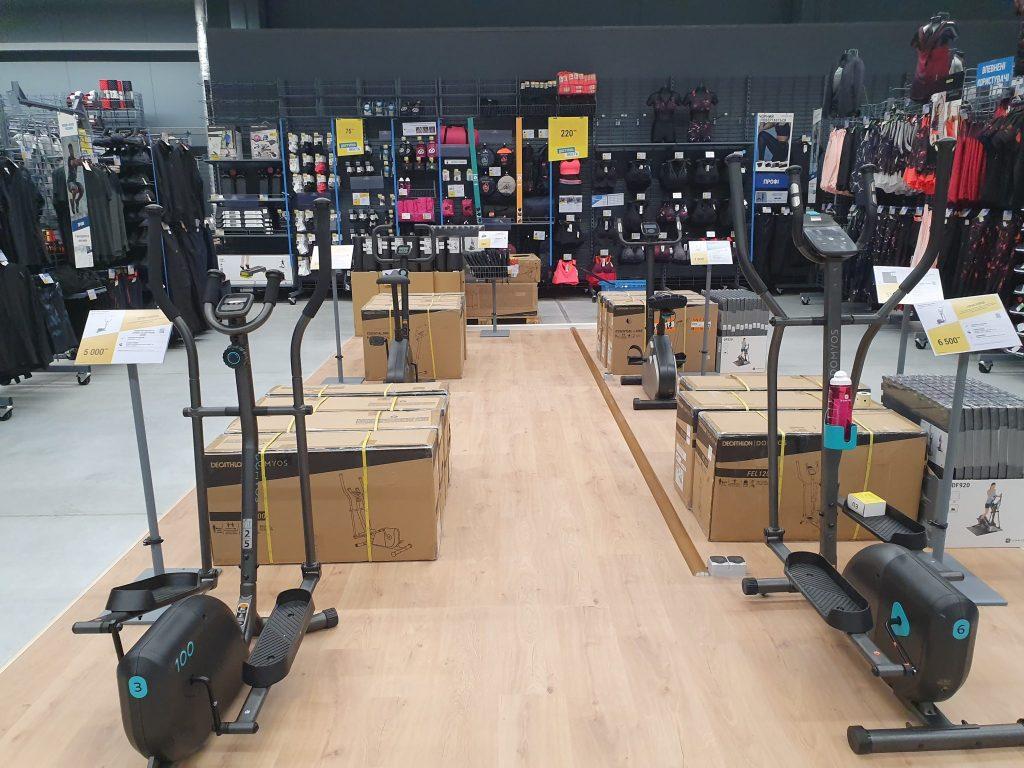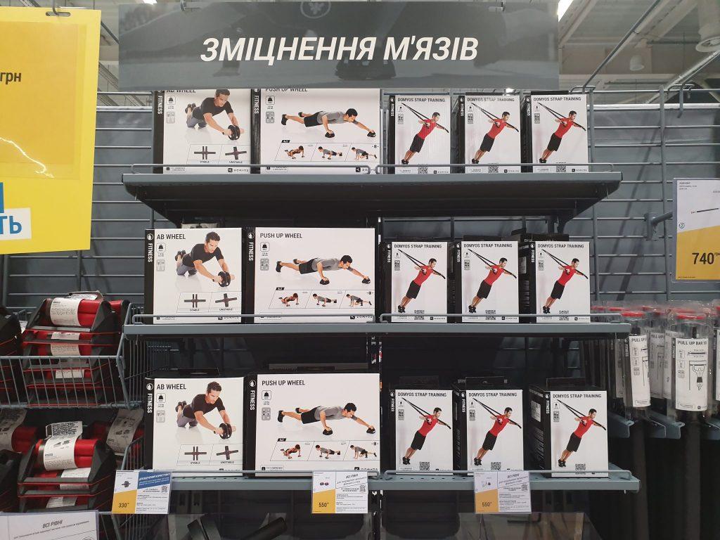 У відділах фітнесу, кросфіту і пілатесу можна знайти як дрібний інвентар – скакалки, резинки, обручі, роли, – так і великі тренажери, призначені для спортзалів. Ще кілька відділів присвячені кардіо-тренуванням. Тут представлені бігові кросівки, спортивний одяг, домашні тренажери. Окремо знаходиться зона товарів для спортивної ходьби.