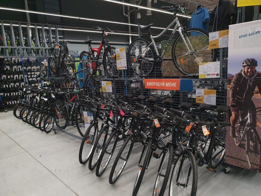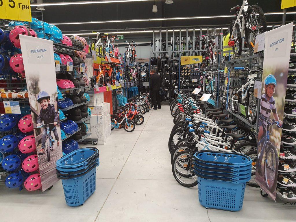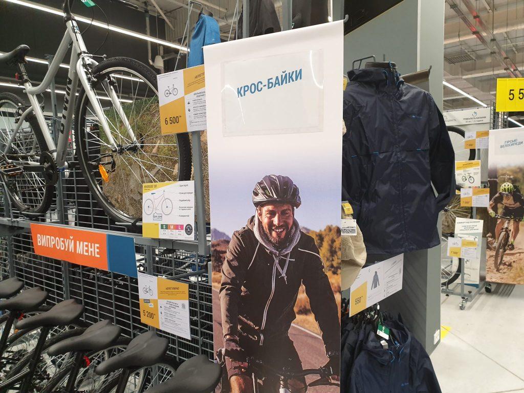 На початку кожного відділу є підписи, щоб шукати потрібний товар було швидше і зручніше. У другому і третьому відділі знаходяться велосипеди, комплектуючі та аксесуари – вся екіпіровка, необхідна для практики цього виду спорту. Представлені вони під марками Decathlon – Rockrider і B’Twin.