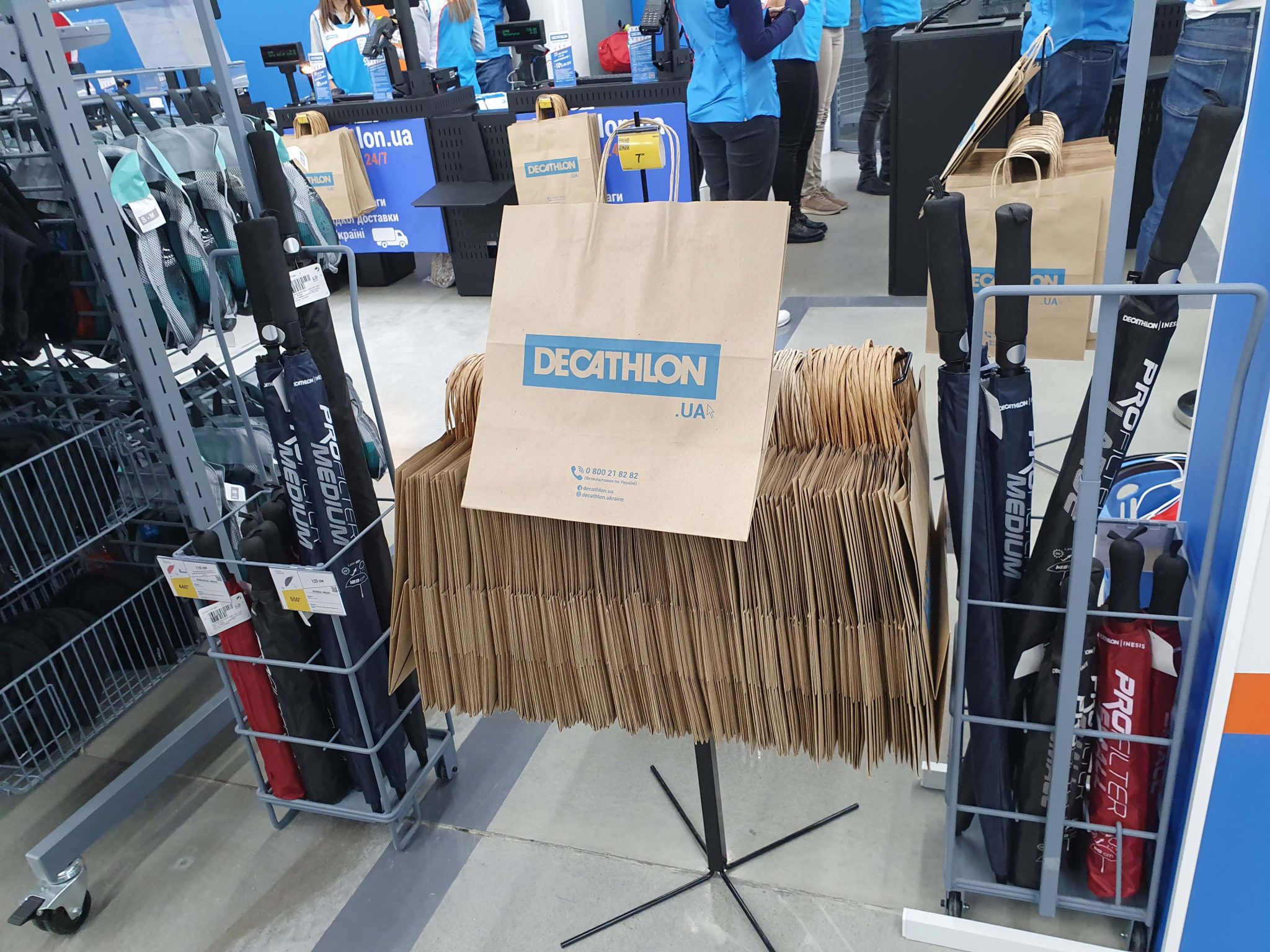 Всі сумки в магазині паперові або з матерії, вартість їх стартує з 7 грн. “Ми повністю відмовилися від поліетилену”, – акцентують увагу в Decathlon. І додають, що на відмові від пакетів еко-спрямованість рітейлера в Україні не закінчується. Всі 43 співробітника Decathlon на Берковецькій сортують сміття в чотирьох спеціально обладнаних по магазину точках, після чого відправляють його на переробку в Обухівський КБК, з яким укладено офіційний контракт.