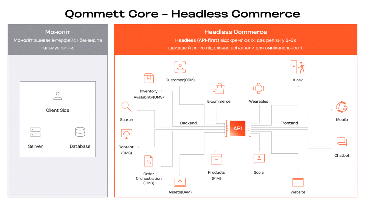 - Qommett Core (Headless Commerce): гнучка архітектура, де клієнтська частина відділена від ядра. Це дає бізнесу свободу оновлювати каталог чи запускати маркетплейс без ризику «зламати» всю систему. Компанія формує екосистему enterprise-рішень із партнерами Vendure, Medusa, Strapi та Algolia;