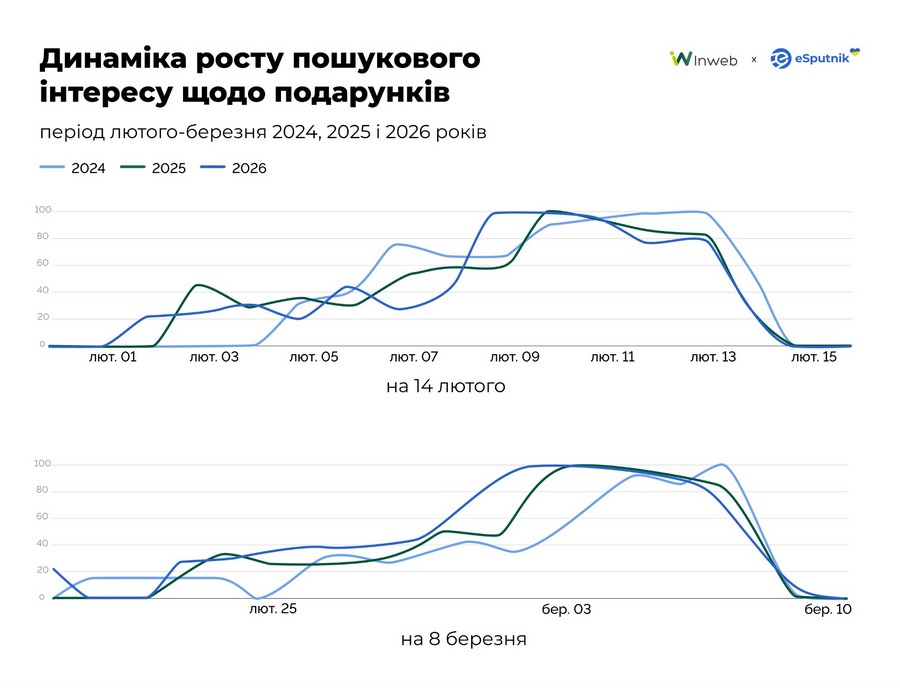 У 2026 році попит перед сезонними святами змістився на більш ранні дати. Пошуковий інтерес до 14 лютого почав зростати вже 1 лютого — приблизно на 5 днів раніше, ніж у 2024 році. Перед 8 березня активна фаза попиту стартувала 20-23 лютого — майже на тиждень раніше, ніж два роки тому.
