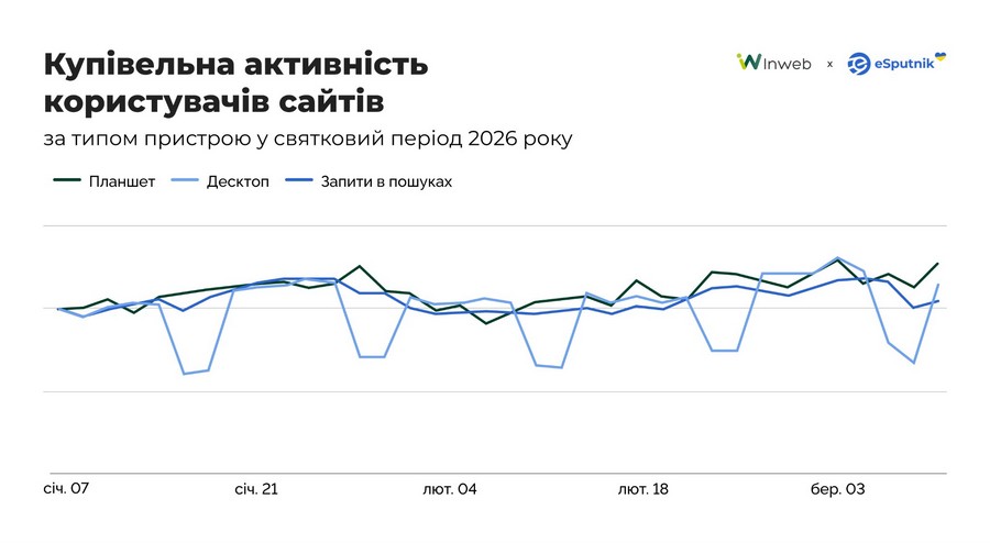 CDP eSputnik та Inweb проаналізували поведінку покупців, динаміку трафіку та маркетингових комунікацій українського eCommerce у лютому-березні 2026 року. Дослідження охоплює внутрішню аналітику найбільшої української CDP eSputnik та Inweb Performance Agency, дані Google Trends, Similarweb за період з 1 лютого до 12 березня 2026 року та порівнює результати з 2024-2025 роками.