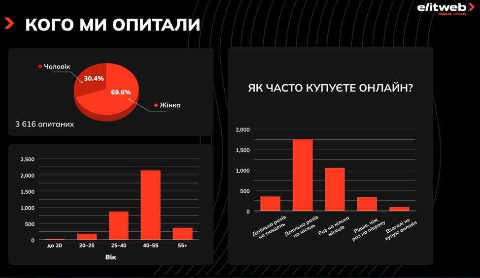 Серед респондентів переважали жінки — 70%, відповідно чоловіки становили 30%. Основну частину вибірки склали користувачі платоспроможного віку, зокрема у вікових групах 25–40 та 40–55 років. Уже на цьому етапі стало очевидно, що український онлайн-споживач доволі активний. Більшість респондентів здійснюють покупки в інтернеті кілька разів на місяць.