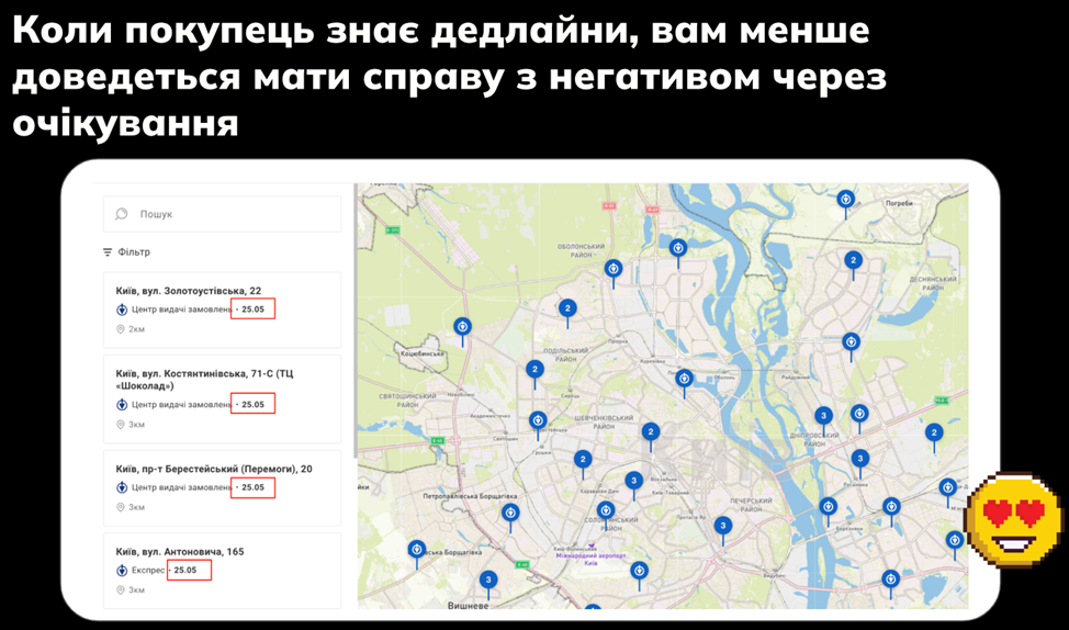 Клієнти цінують прозорість і передбачуваність. Найзручніше, коли ще у процесі оформлення замовлення покупець бачить точну дату доставки. Якщо технічно показати це на такому етапі неможливо, потрібно принаймні інформувати клієнта про статус замовлення SMS-повідомленнями чи листами.