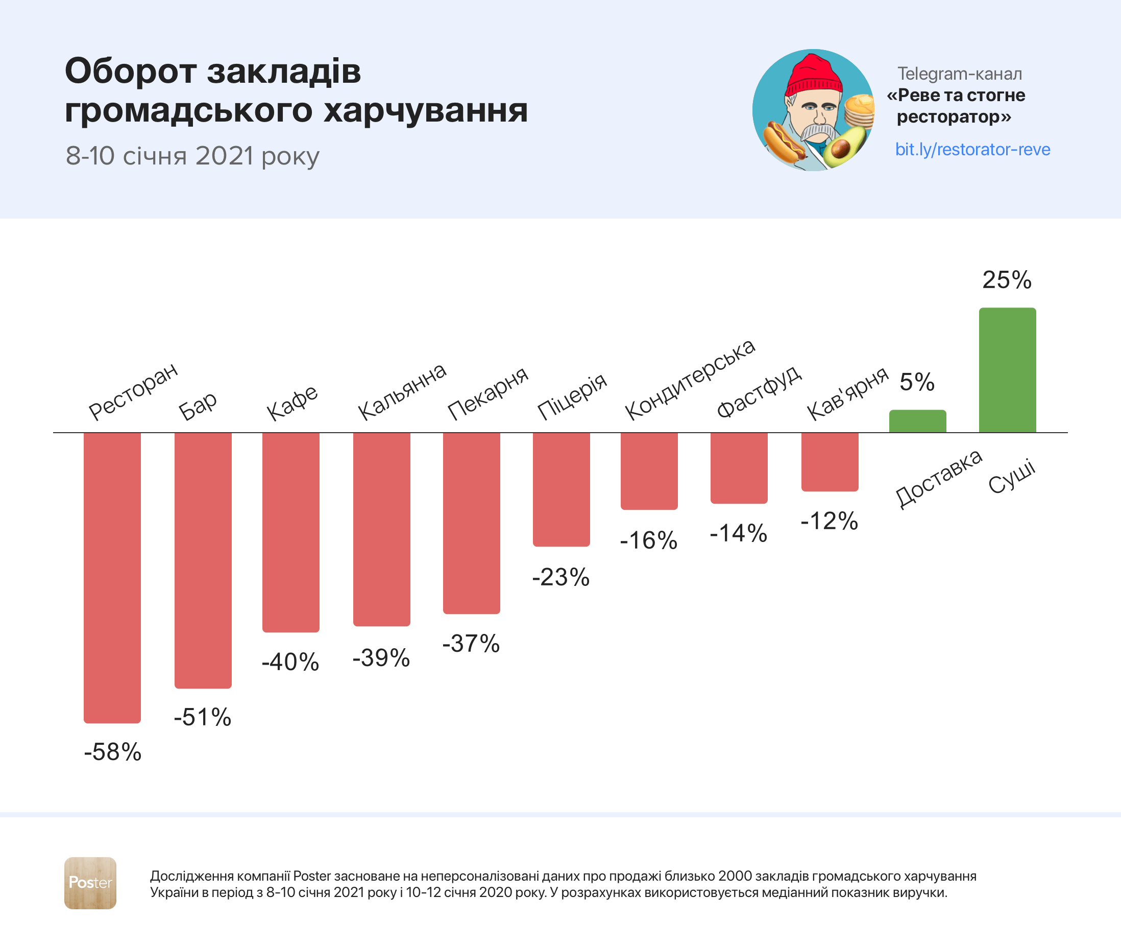 Дослідження засноване на неперсоналізованих даних про продажі близько 2000 закладів громадського харчування України. Порівнянні періоди – 8-10 січня 2021 року і 10-12 січня 2020 року. У розрахунках використовується медіанний показник виручки.