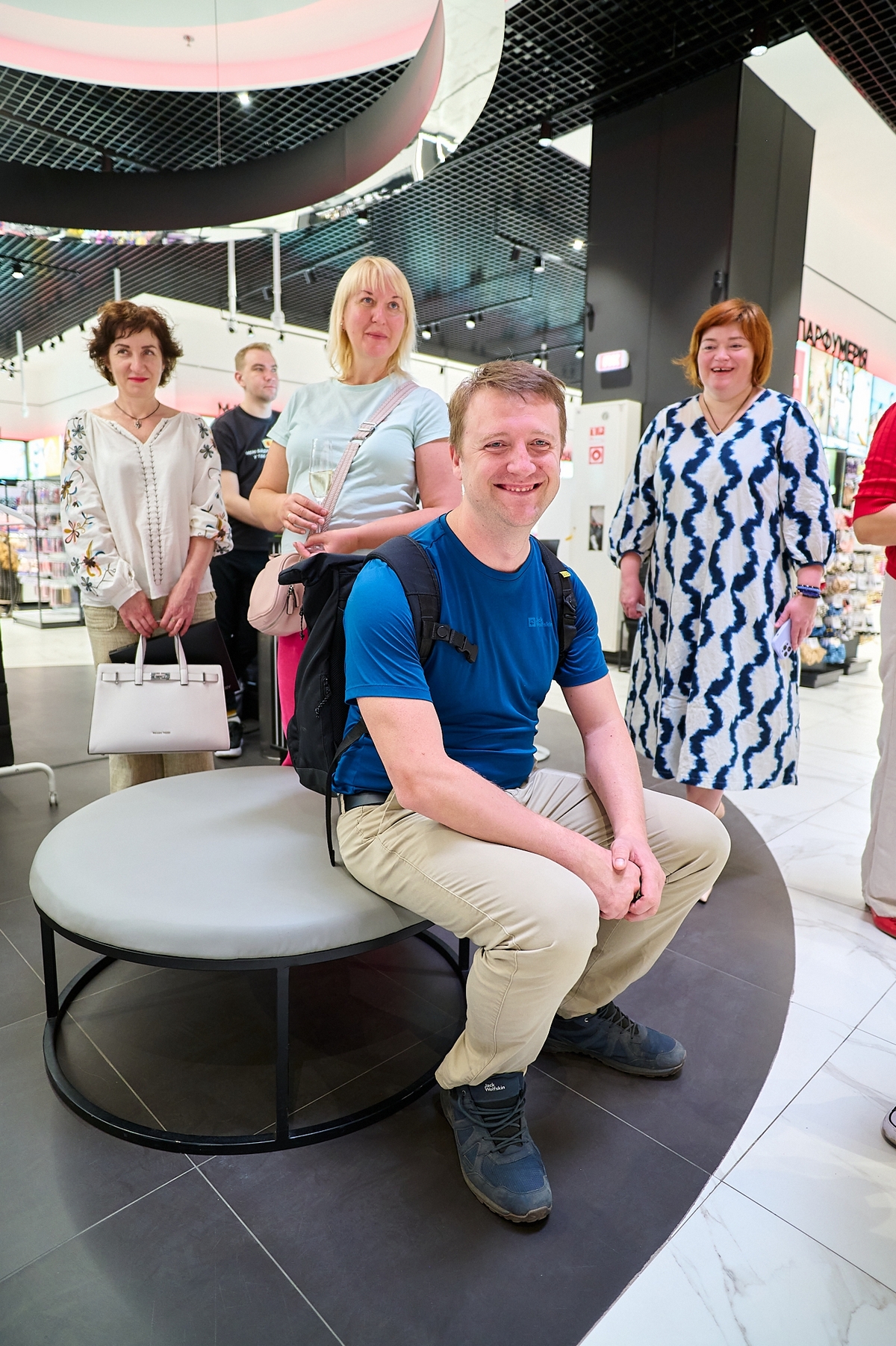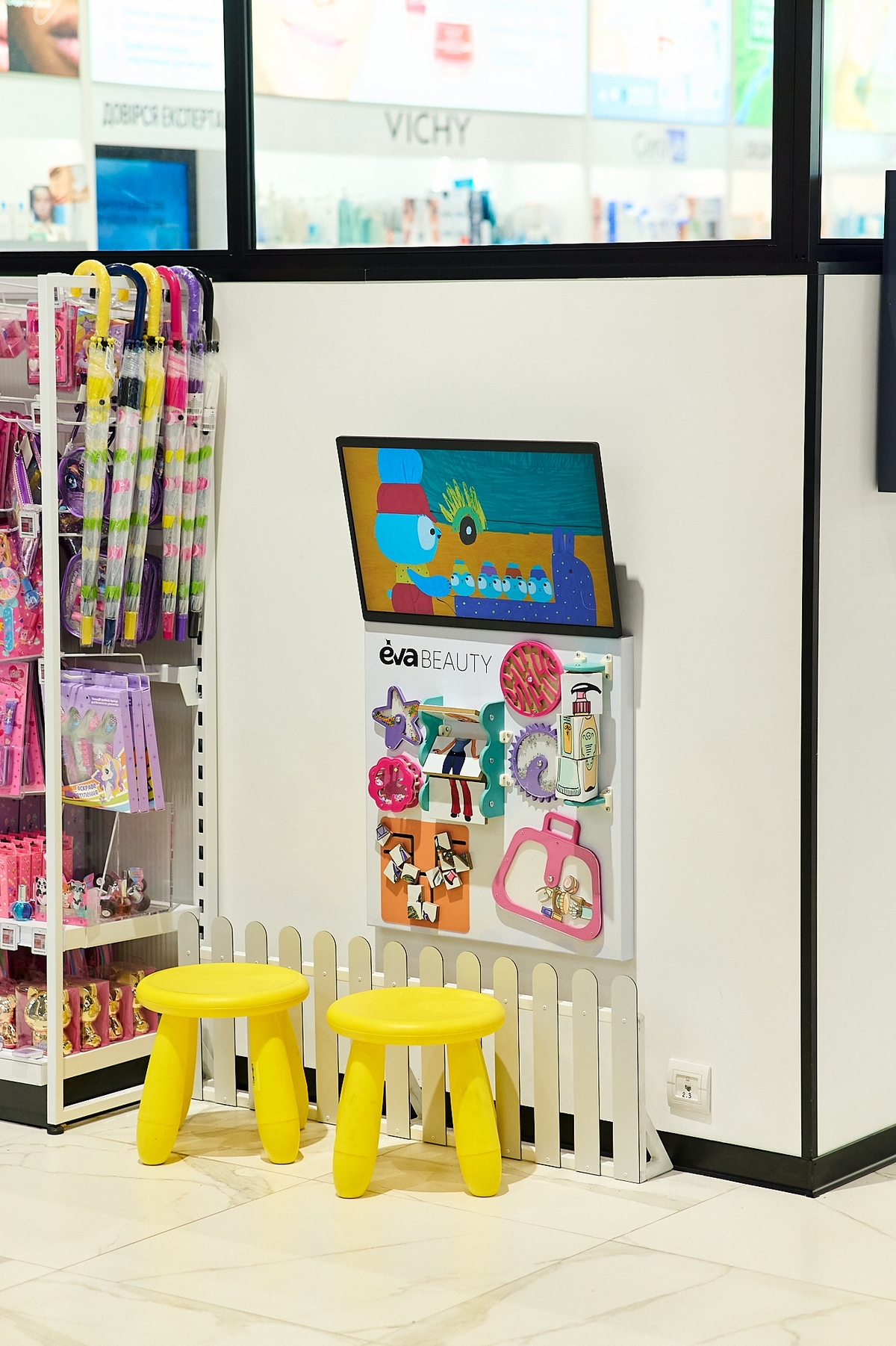 Окремо варто відмітити піклування Eva про чоловіків. В середині залу встановлені пуфіки, на яких стомлені від шопінгу чоловіки можуть відпочити, поки їх дружини підбирають собі косметику. Не вистачає тільки PlayStation.