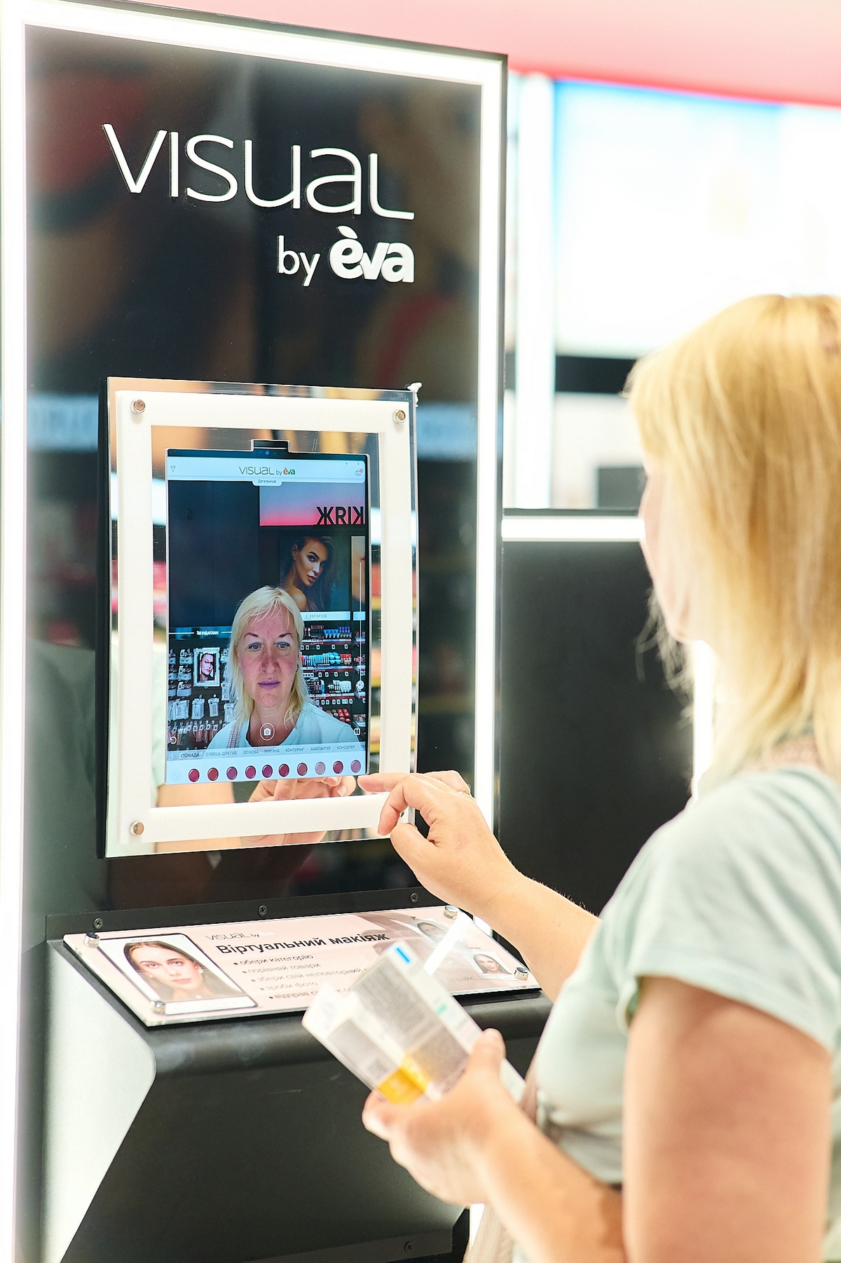 Особливу увагу привертає інноваційний екран Visual by Eva. Це власна розробка компанії, яка дозволяє самостійно підібрати будь-який макіяж: від блиску до губ до нарощених вій та кольору волосся. Штучний інтелект на екрані відтворює зображення людини із обраними кольорами, то ж кожен або кожна може подивитися, як та чи інша косметика підходить саме їй.