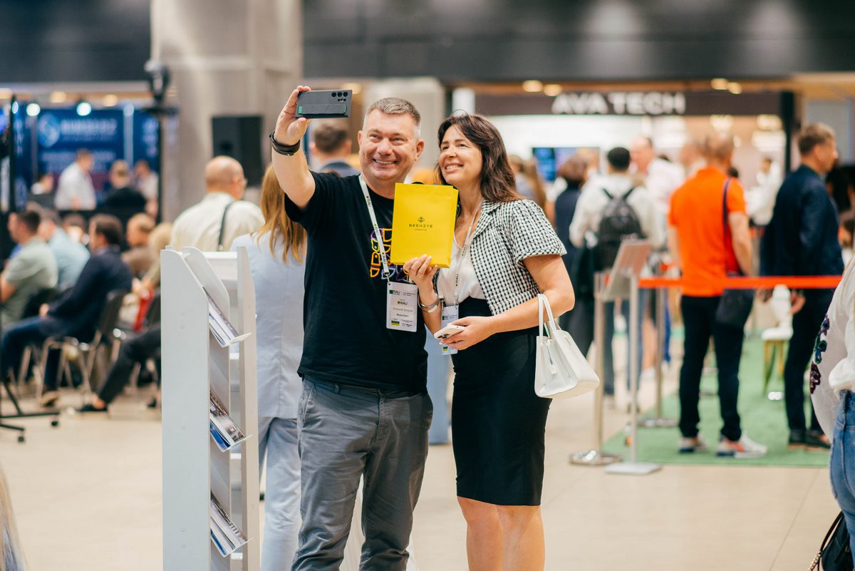 Топ-менеджери радо вітали один одного та робили фото на пам’ять. На фото CEO Фокстрот Олексій Зозуля та співвласниця Beehive Cosmetics Ніна Домбровська