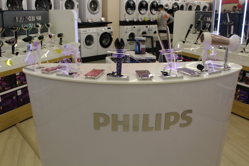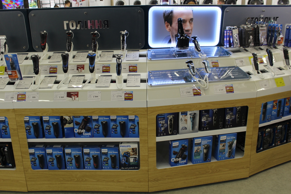Взагалі, в торговому залі досить багато вітрин і стелажів, брендованих логотипами виробників. Особливо виділяється зона Philips, де пропонується дрібна побутова техніка: бритви, фени, плойки і так далі.