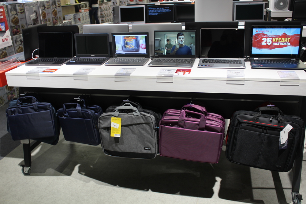 Зрозуміло, представлені ноутбуки та смартфони. Причому для зручності клієнтів прямо поруч з товаром розміщені сумки та інші аксесуари. Вибравши ноутбук, можна відразу ж підібрати і відповідну сумку. Розумно і зручно.
