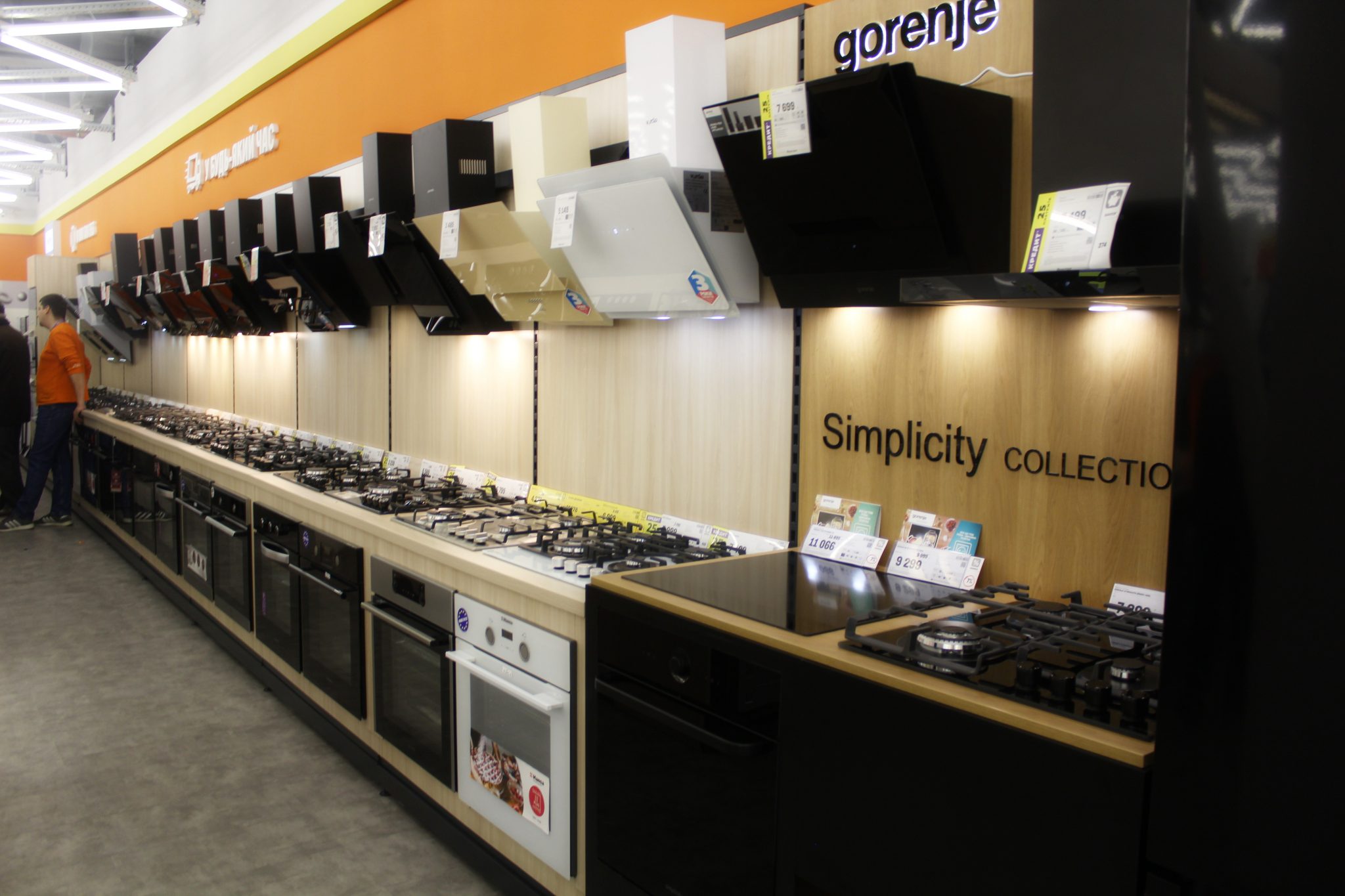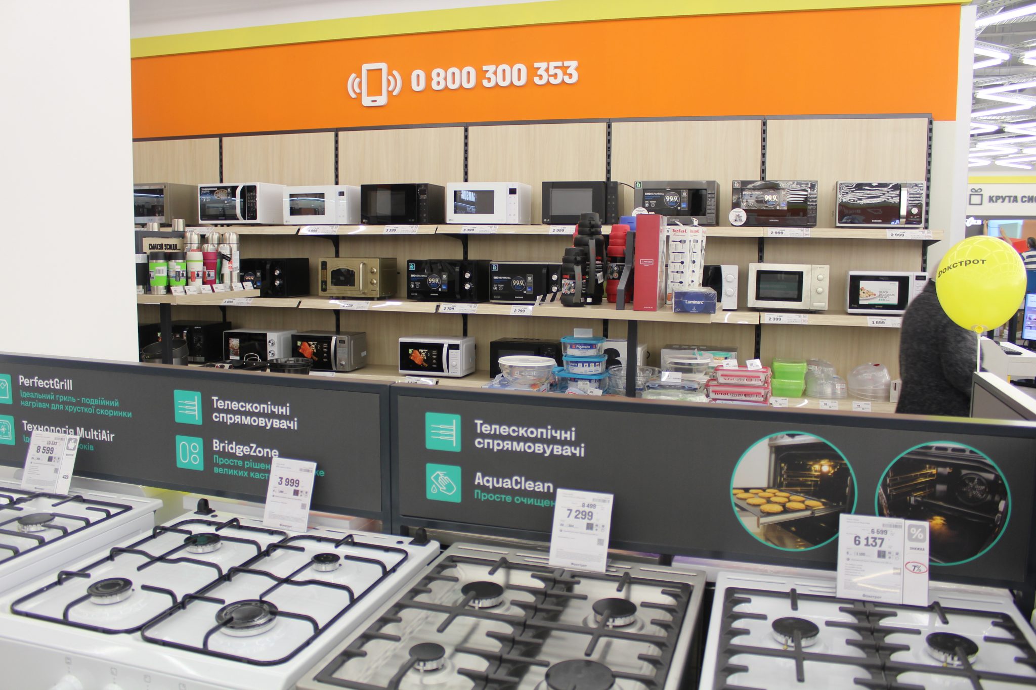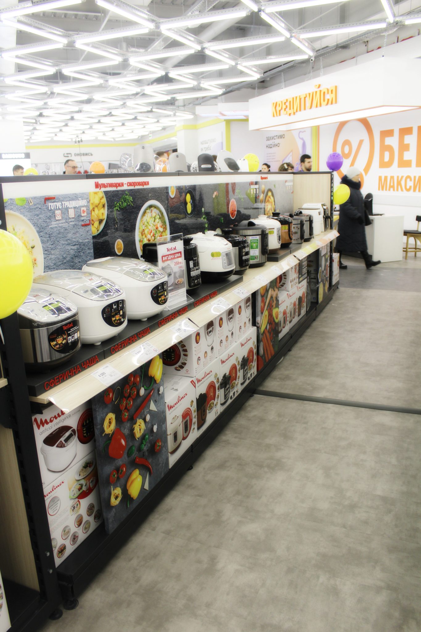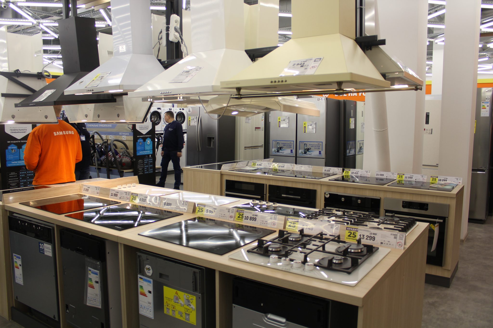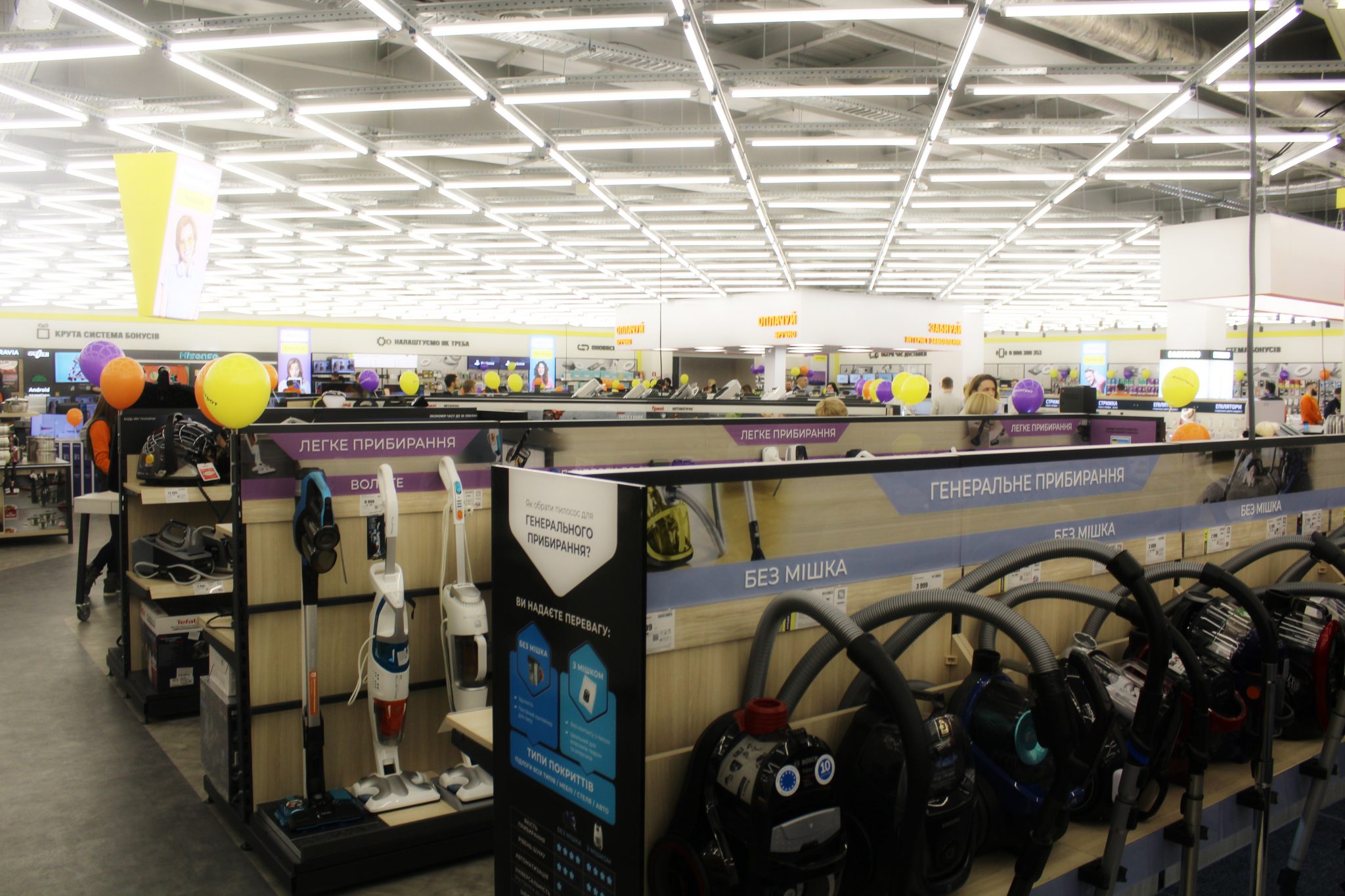 Щоб досягти такого ефекту, велику побутову техніку – пральні машини, холодильники й кондиціонери, плити та витяжки – розмістили в глибині. Тепер, щоб ознайомитися з асортиментом невеликих побутових пристроїв, не доведеться лавірувати між холодильними шафами або іншим громіздким обладнанням.