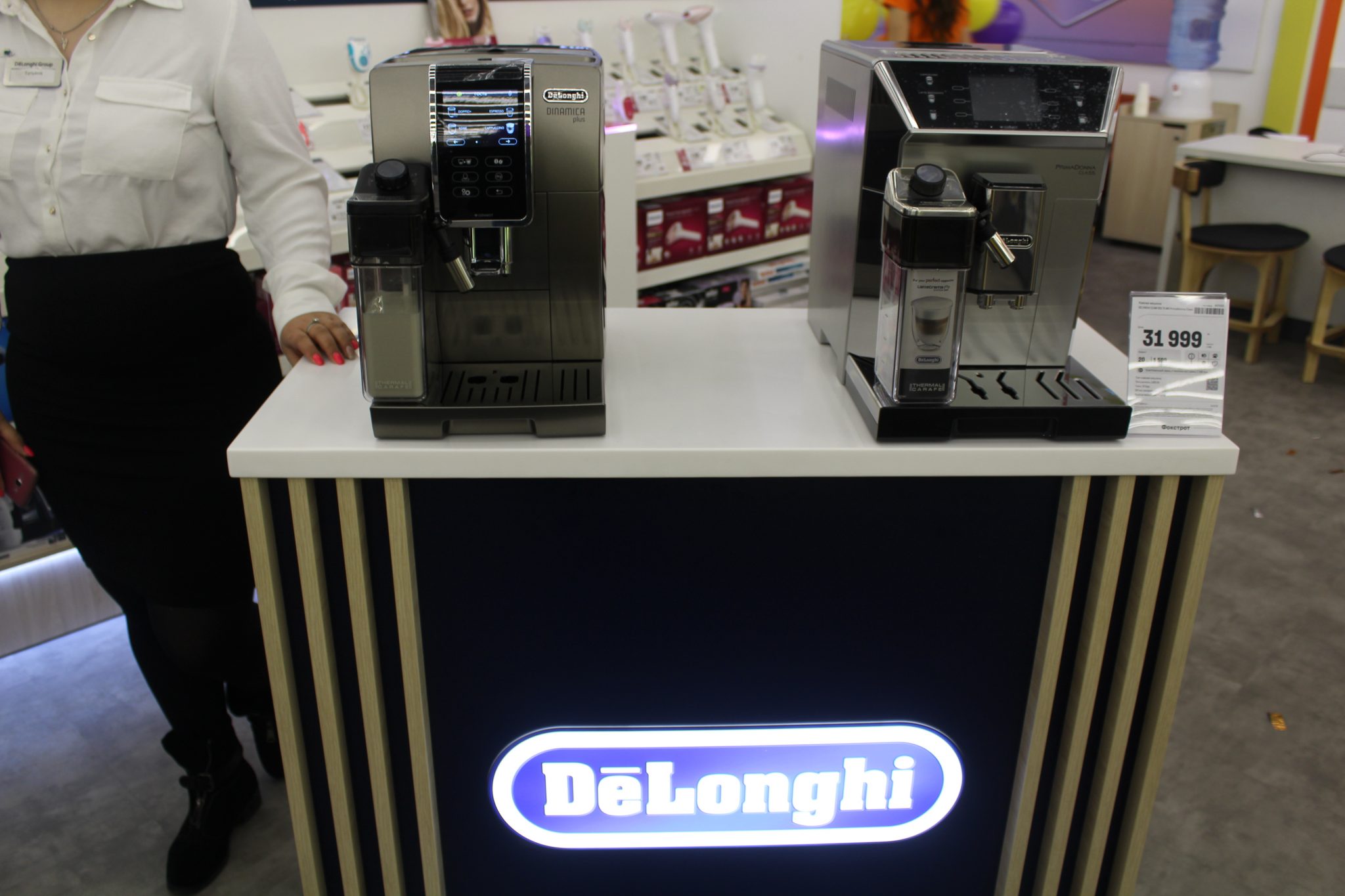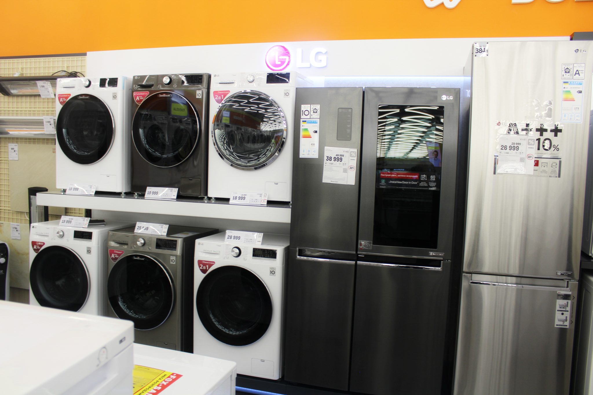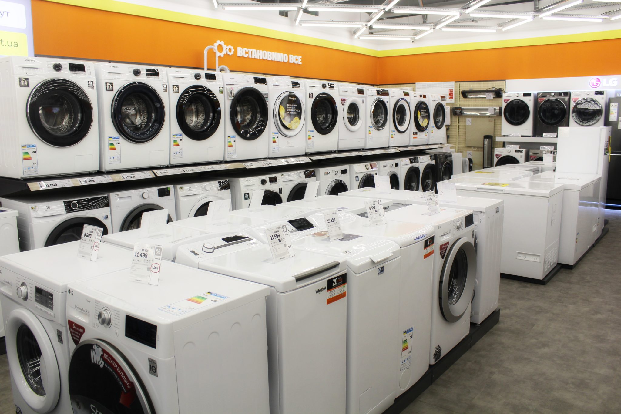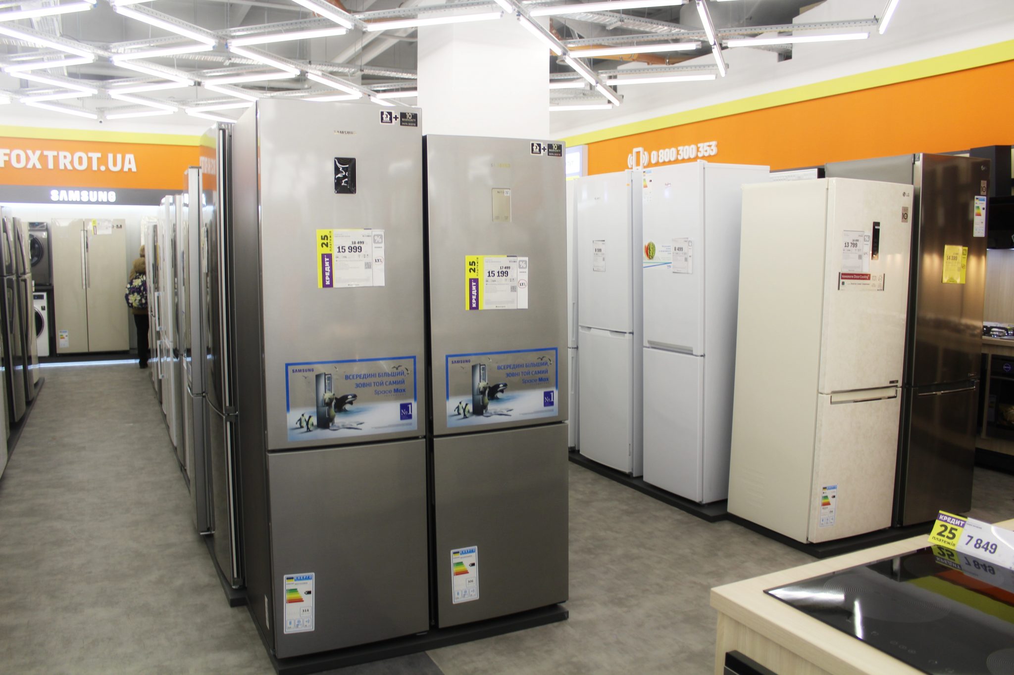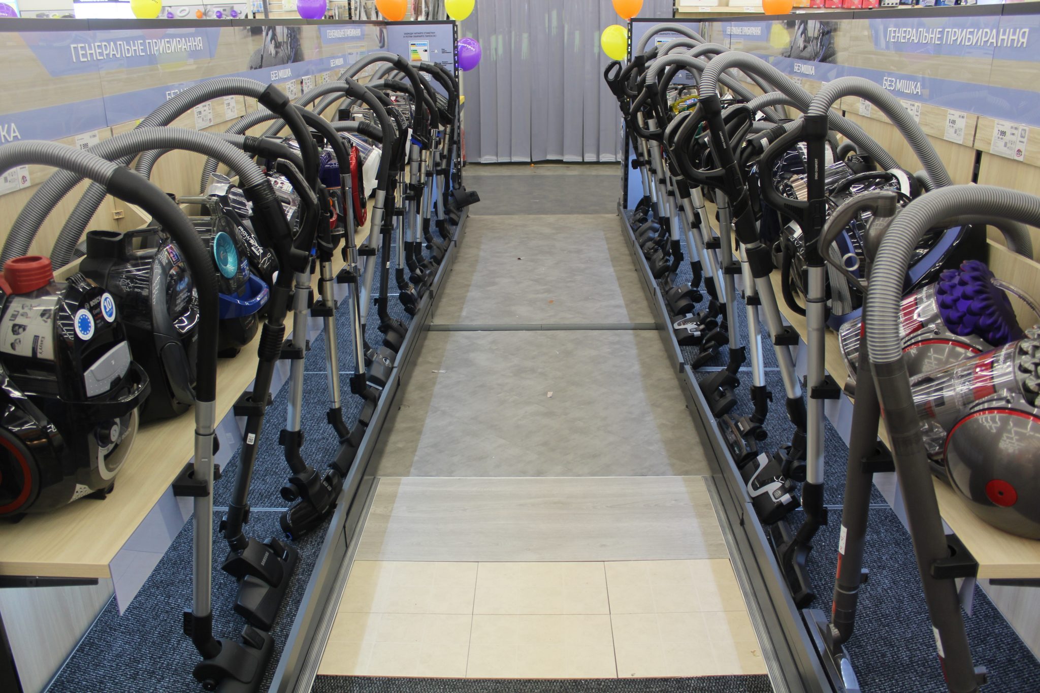 Щоб досягти такого ефекту, велику побутову техніку – пральні машини, холодильники й кондиціонери, плити та витяжки – розмістили в глибині. Тепер, щоб ознайомитися з асортиментом невеликих побутових пристроїв, не доведеться лавірувати між холодильними шафами або іншим громіздким обладнанням.