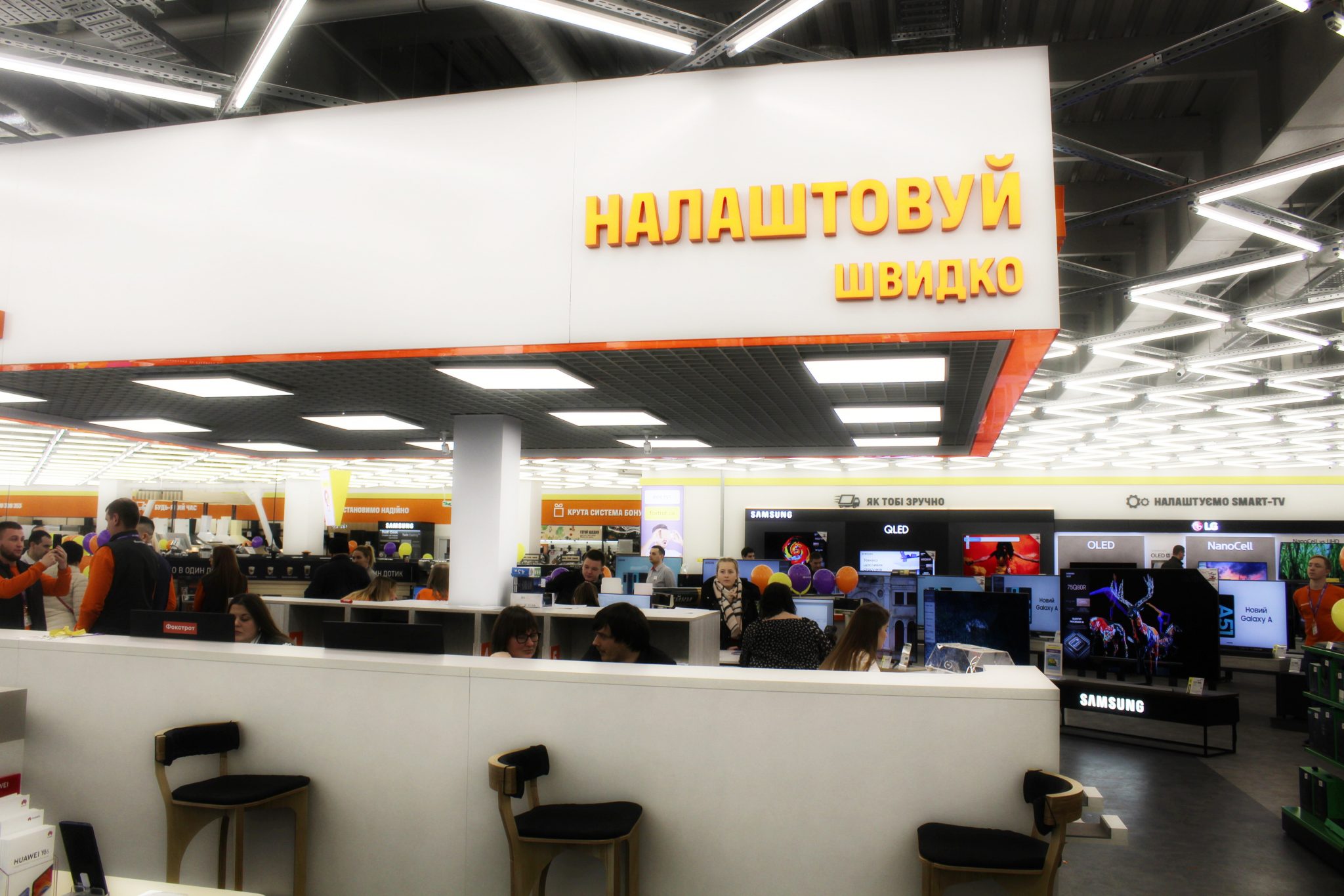 Прямо по центру залу розташований хаб, де знаходиться відділ видачі інтернет–замовлень, каса, та сервісний відділ. Відразу після отримання покупки можна перевірити її працездатність, і попросити фахівців допомогти з настройками або встановленням додаткових програм. Все для зручності клієнта.