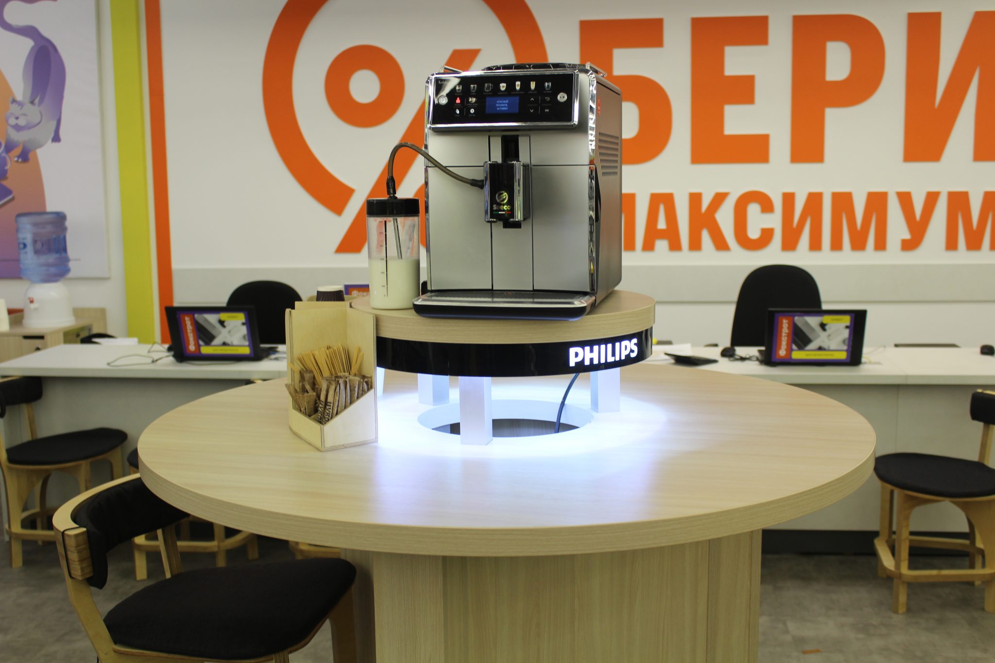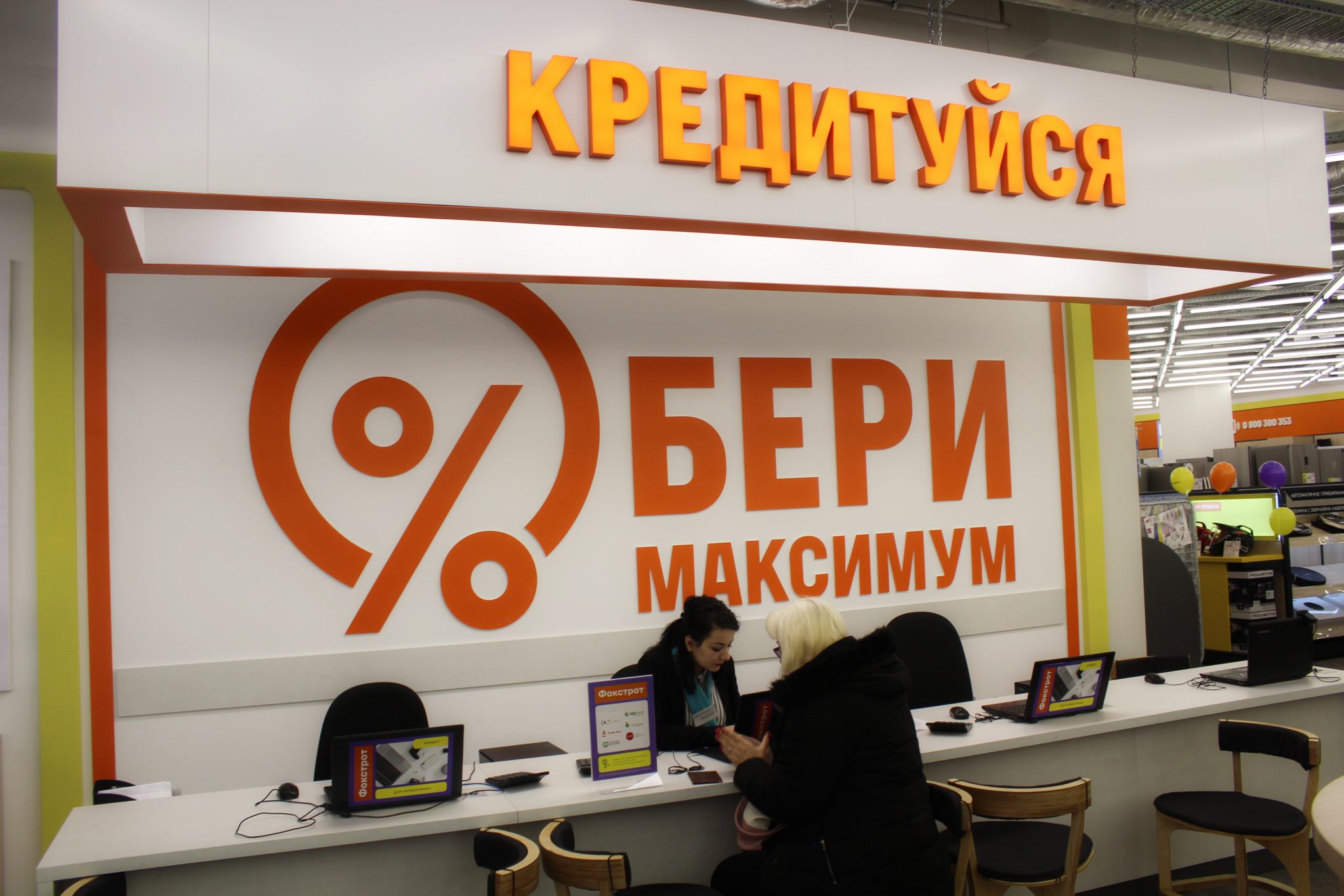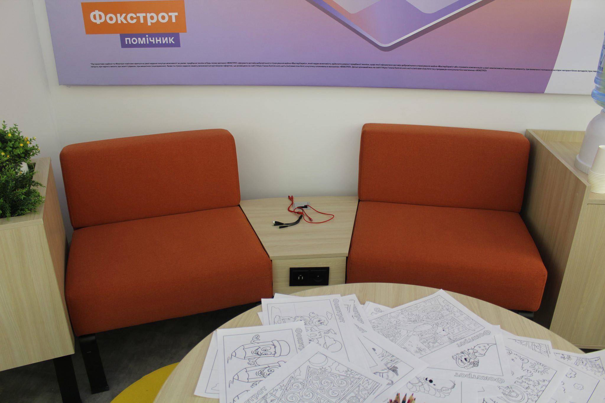 Про комфорт відвідування магазину в Фокстрот подумали грунтовно. Неподалік відділу видачі кредитів знаходиться куточок відпочинку, де клієнти зможуть посидіти, випити води або свіжозварену на кавомашині каву, підзарядити телефон або інший гаджет.