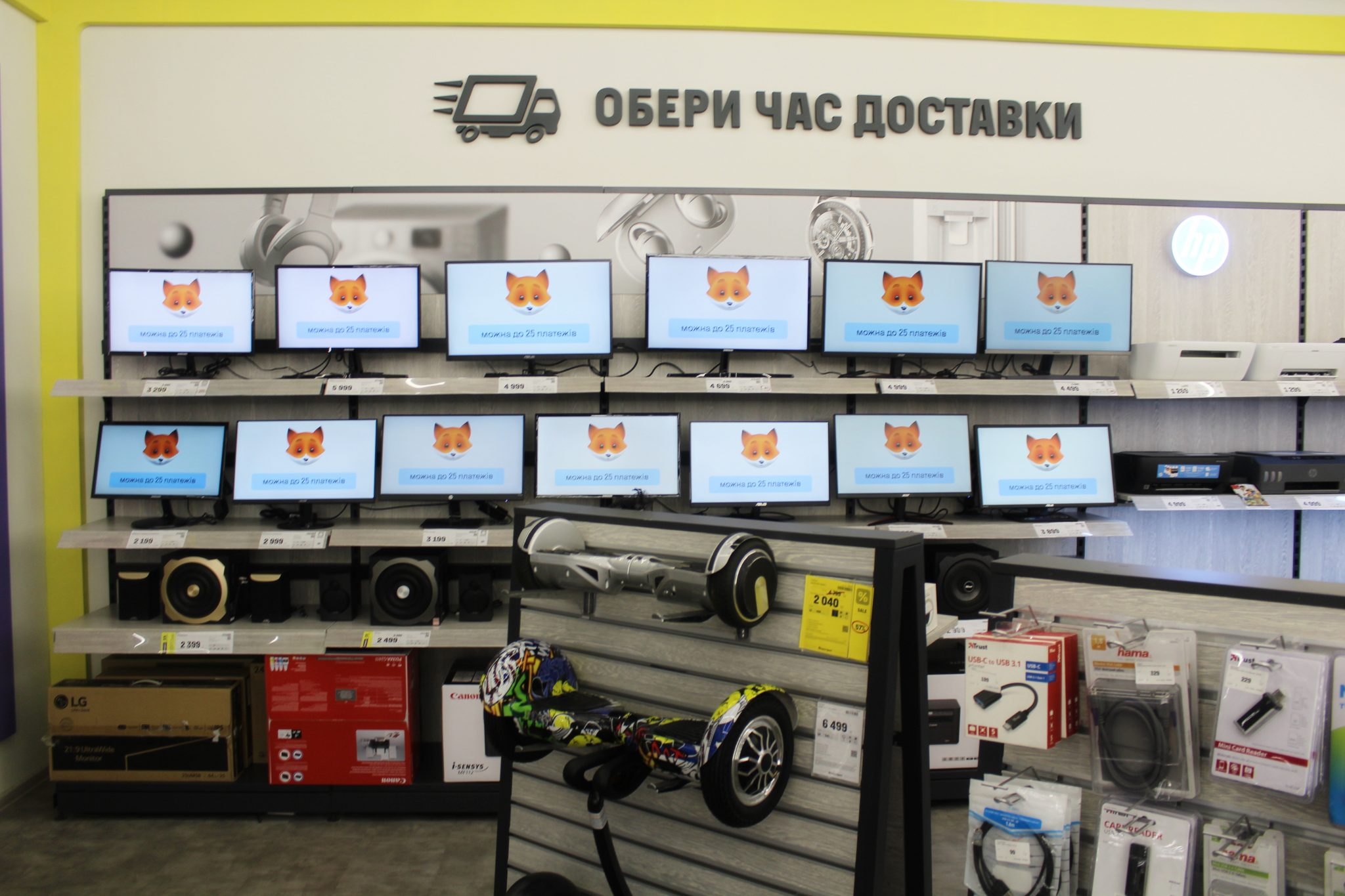 Поруч з ноутбуками – миші, колонки, сумки та рюкзаки, допоміжна апаратура й гарнітура. Цей же принцип дотримується по всьому магазину: все для зручності вибору й оформлення покупки.