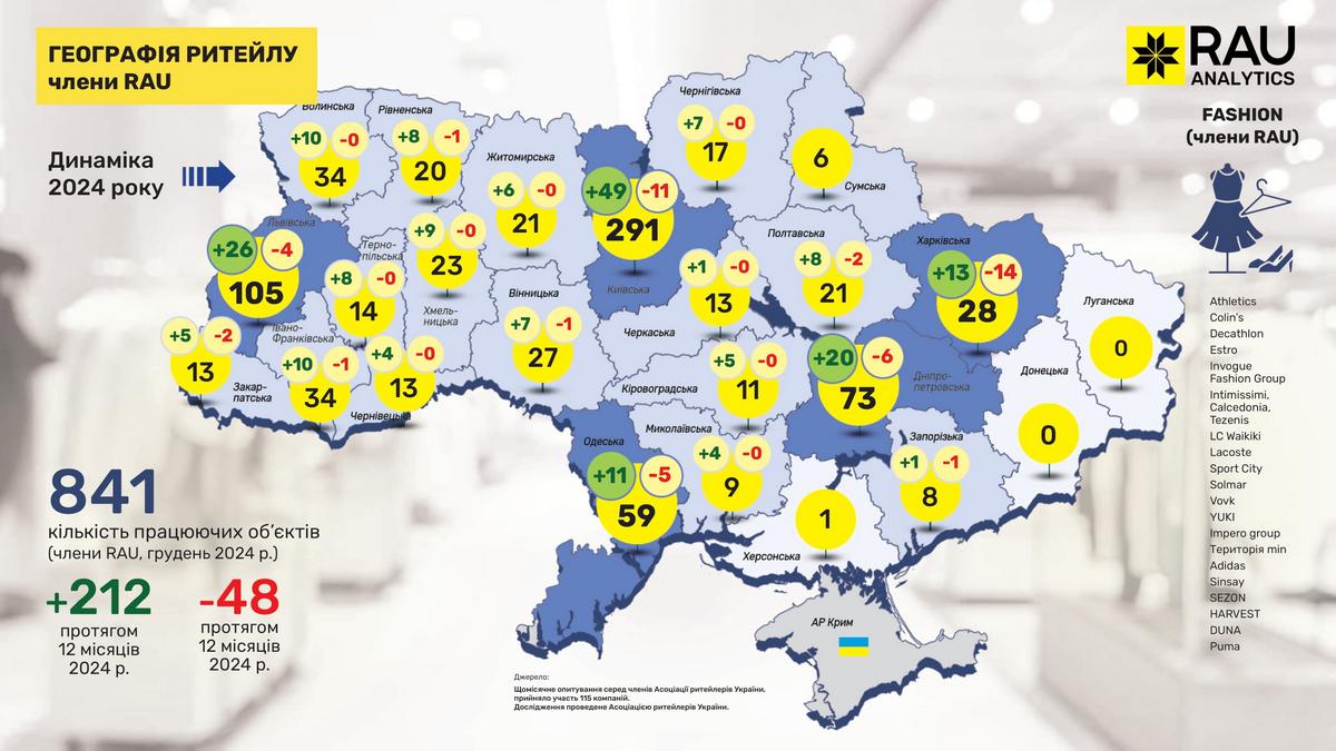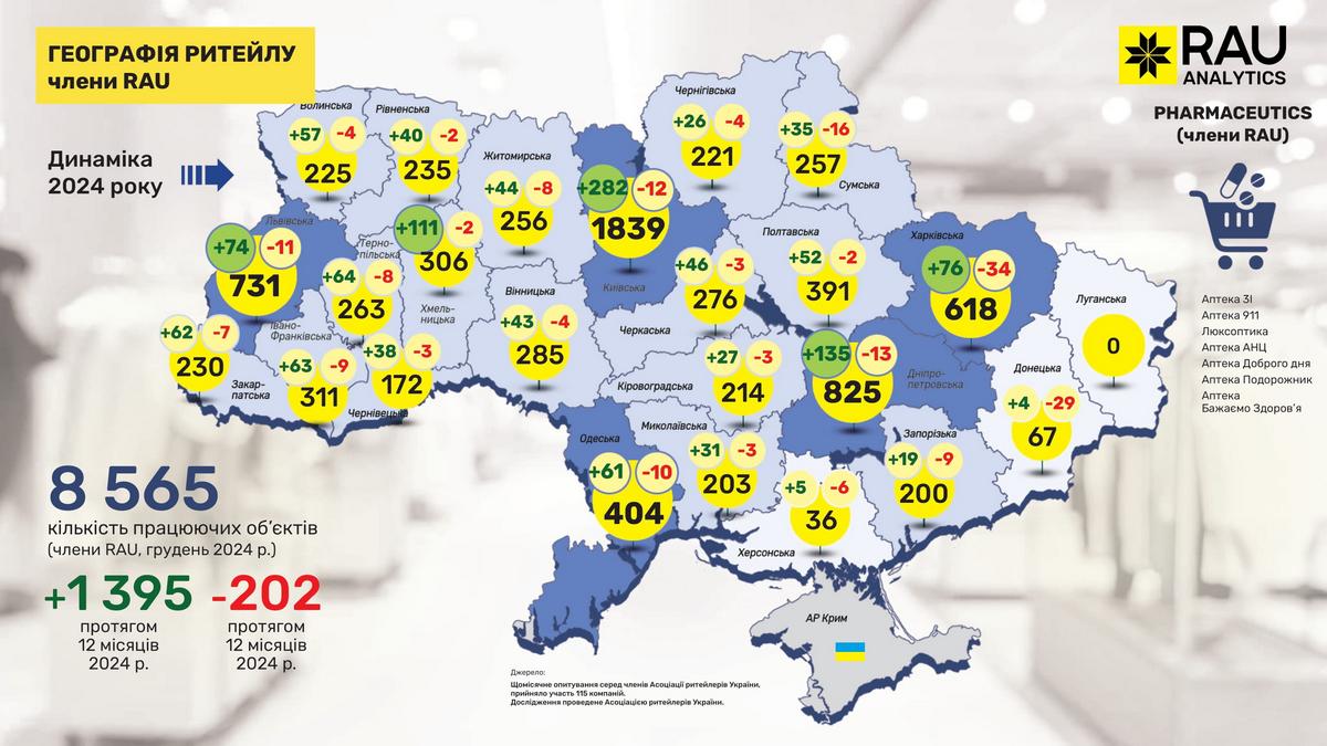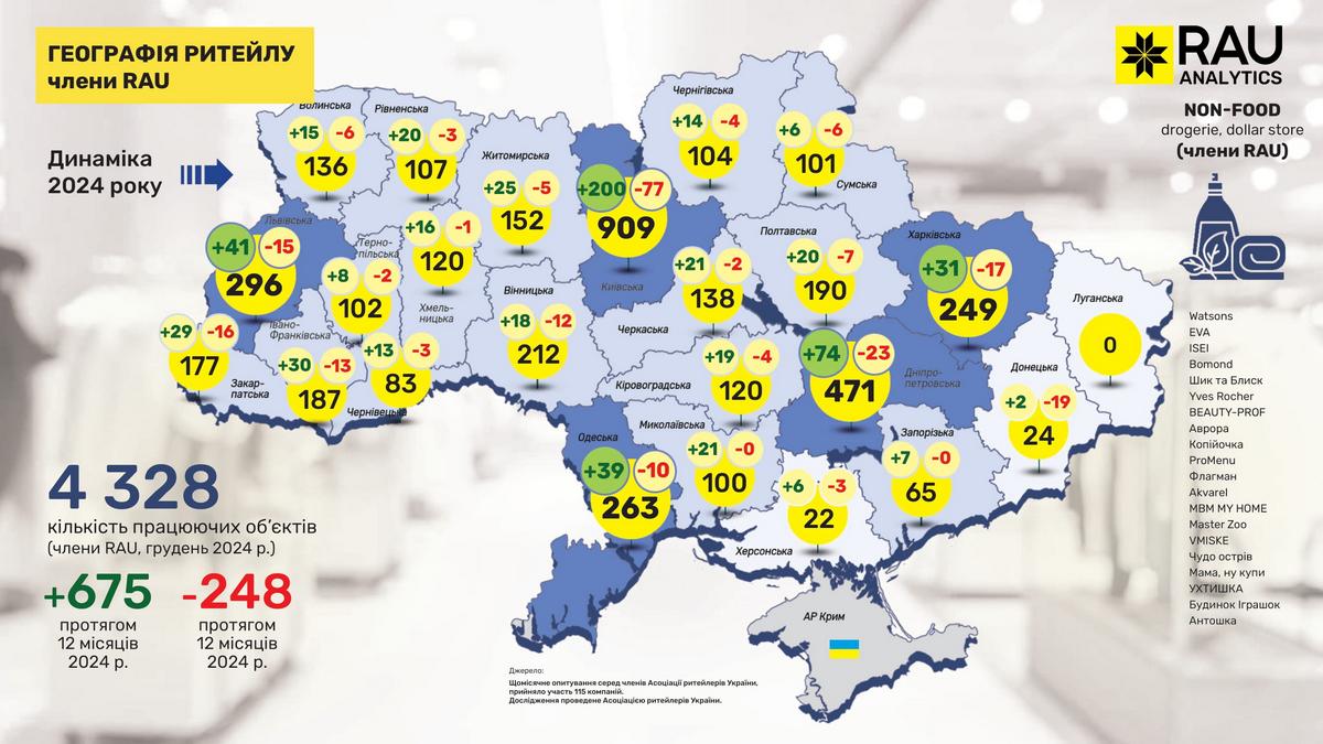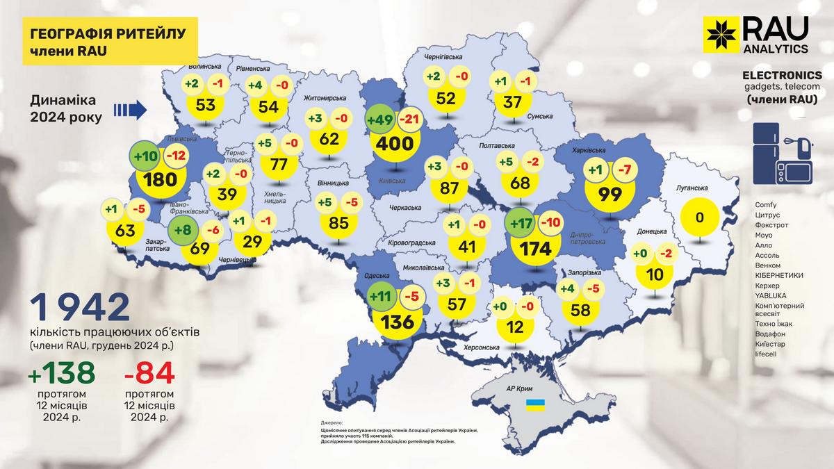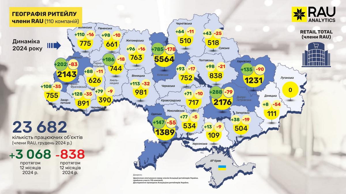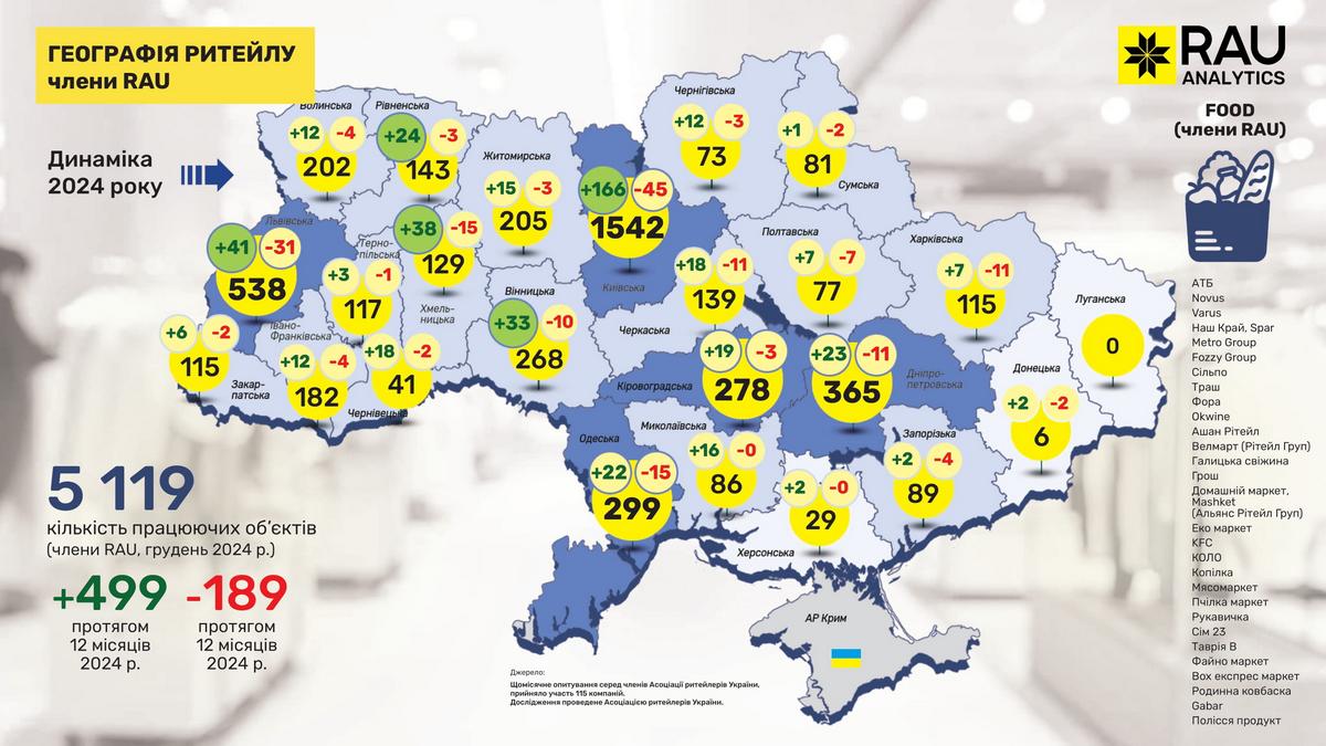 Як показало регулярне щомісячне опитування RAU, проведене серед 110 членів Асоціації ритейлерів, станом на грудень 2024 року в них працювало вже 23 682 торговельні точки у восьми основних галузях ритейлу. Мова йде про продовольчий і непродовольчий ритейл, аптечну торгівлю, fashion, а також продавців техніки та електроніки, мережі АЗК, магазини з продажу ювелірних виробів та сегмент DIY-мереж.