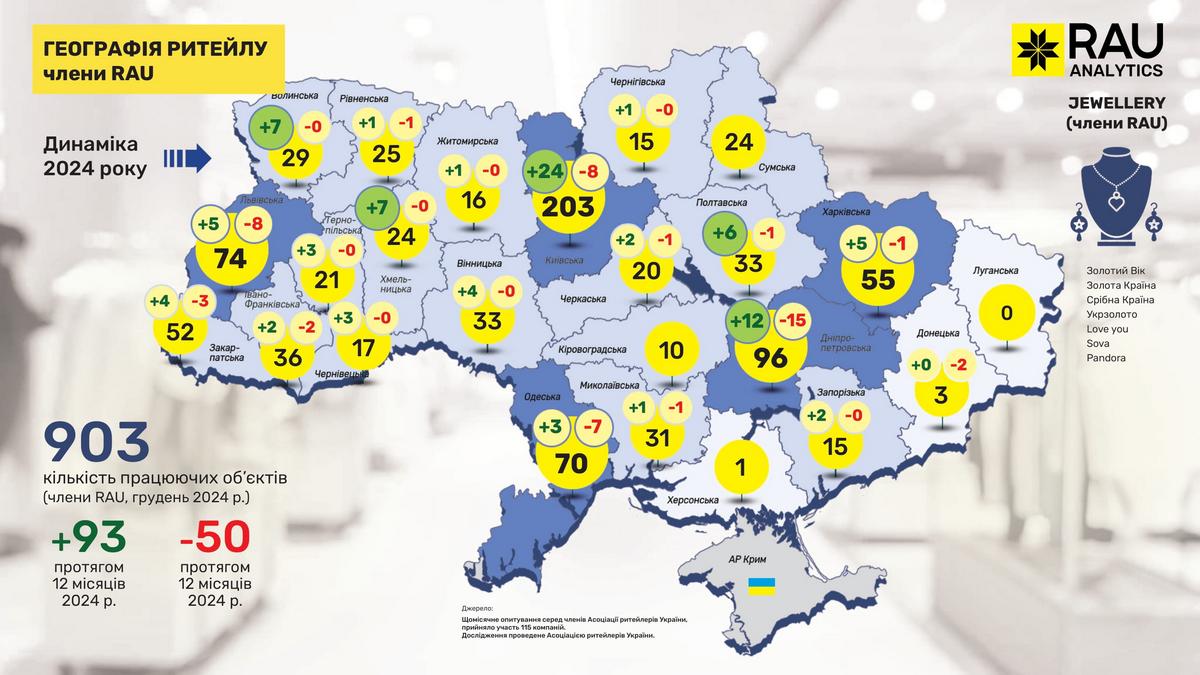 Торгівля ювелірними виробами, яка чи не найбільше постраждала від російського вторгнення, досить непогано відновилася. Так, станом на грудень 2024 року працювало вже 903 точки. За 12 місяців додалося 93 магазини, хоча з урахуванням 50 закритих торгових точок виходить на 43 більше.
