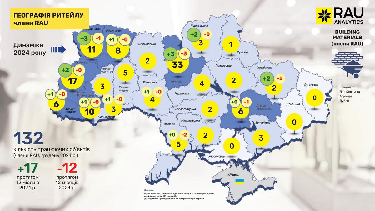 Retail Association of Ukraine представляє річне ексклюзивне аналітичне дослідження під назвою “Географія ритейлу”. На основі даних мереж, які є членами RAU, була зібрана та узагальнена інформація про те, як змінилася географія ритейлу за 12 місяців 2024 року та яка динаміка розвитку галузі по регіонам.