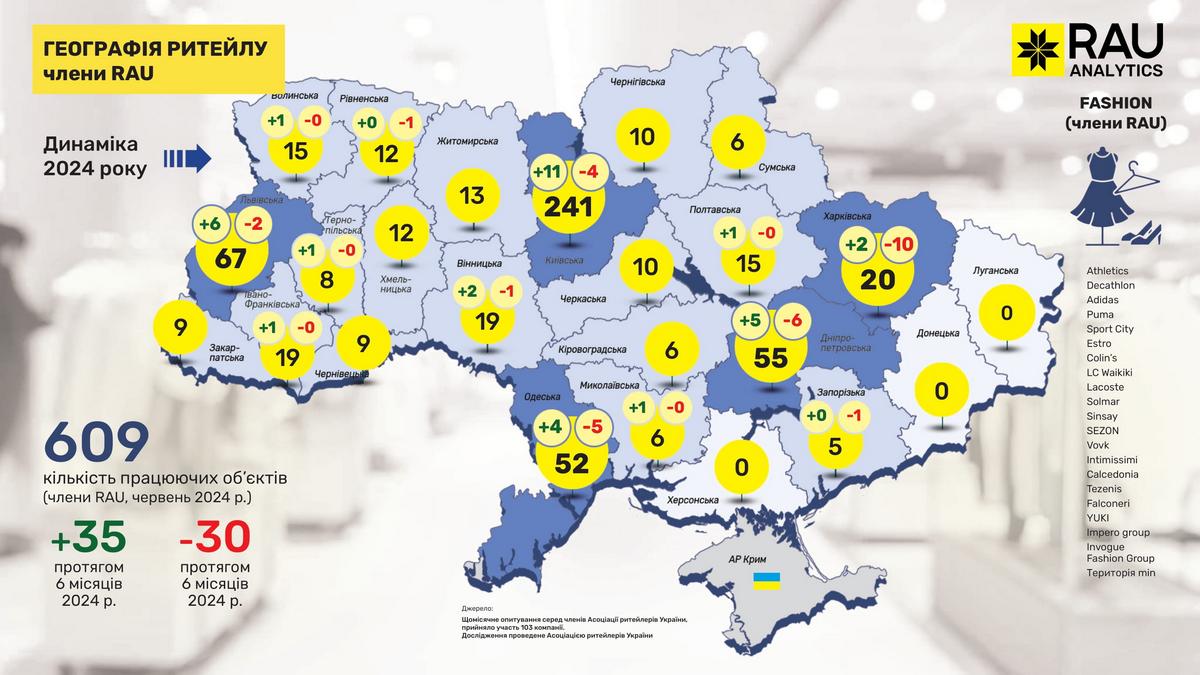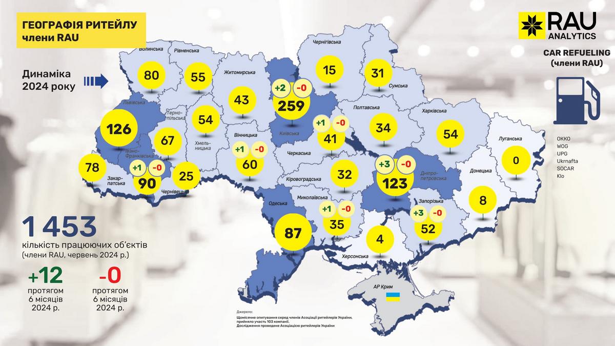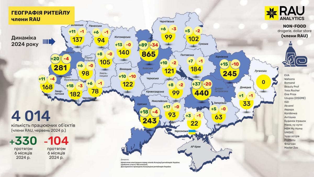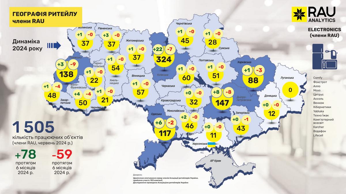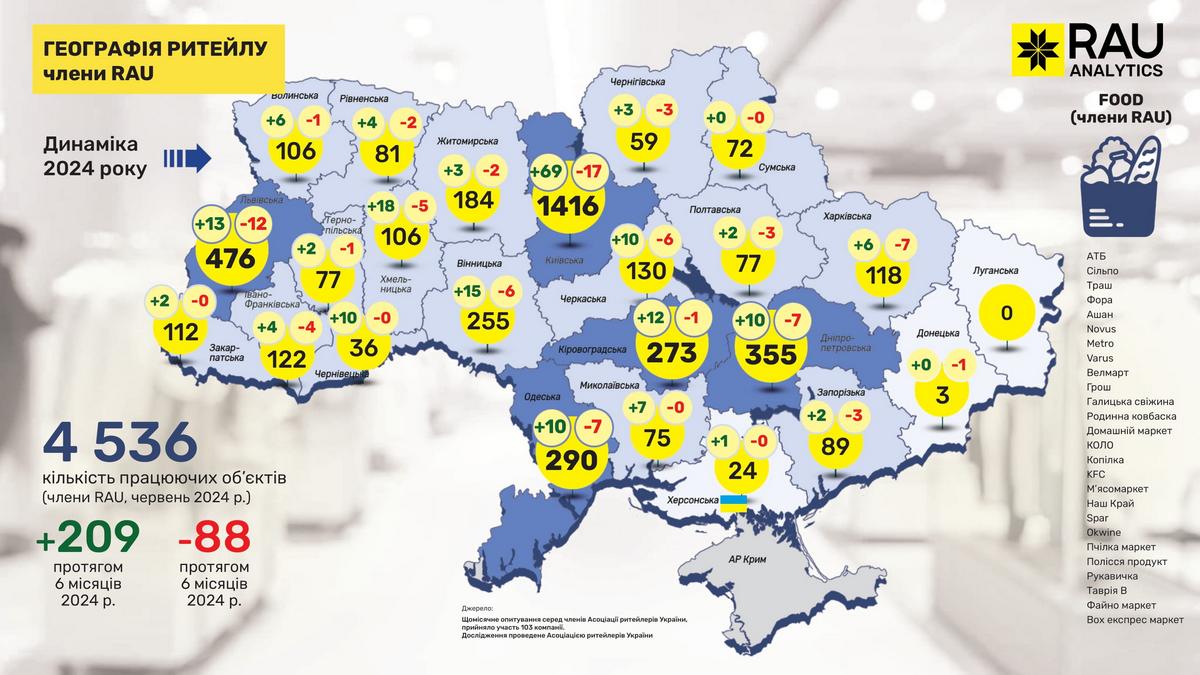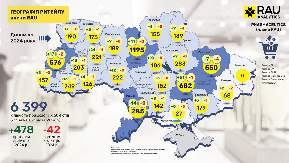Як показало регулярне щомісячне опитування RAU, проведене серед більш ніж сотні членів Асоціації ритейлерів, станом на червень 2024 року в них працювало вже 19 555 торговельних точок у восьми основних галузях ритейлу. Мова йде про продовольчий і непродовольчий ритейл, аптечну торгівлю, fashion, а також продавців техніки й електроніки, мережі АЗК, магазини з продажу ювелірних виробів та сегмент DIY-мереж.