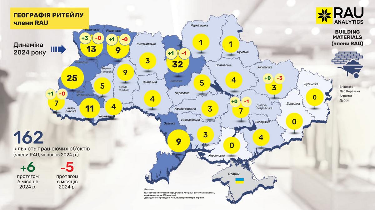 Retail Association of Ukraine представляє чергове ексклюзивне аналітичне дослідження під назвою “Географія ритейлу”. На основі даних мереж, які є членами RAU, була зібрана та узагальнена інформація про те, як змінилася географія ритейлу в першій половині 2024 року та яка динаміка розвитку галузі по регіонам.