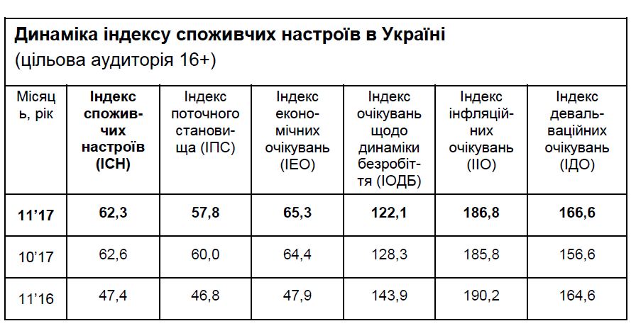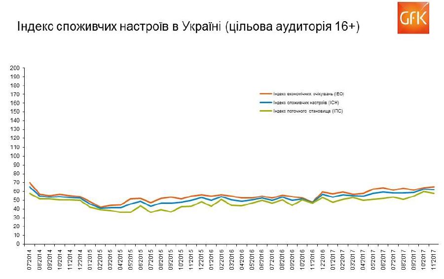 «У листопаді 2017 році індекс споживчих настроїв залишився на рівні жовтня після зростання у вересні. Загрозою для позитивної динаміки індексу є погіршення девальваційних очікувань », – коментують аналітики GfK Ukraine.