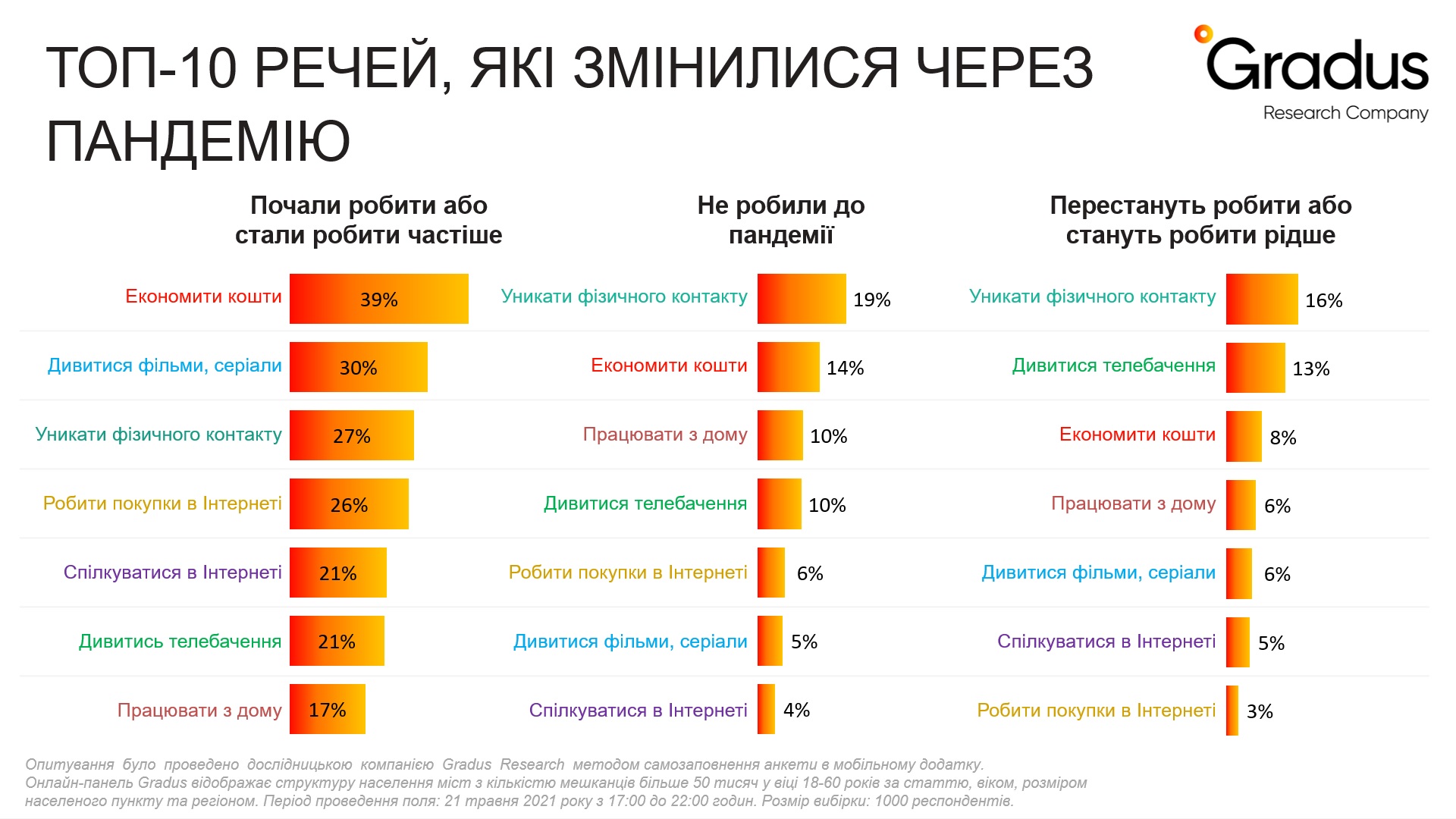 Дослідження було проведено дослідницькою компанією Gradus Research методом самозаповнення анкети в мобільному додатку gradus.app. Онлайн-панель Gradus відображає структуру населення міст розміром більше 50 000 жителів у віці 18-60 років за статтю, розміром населеного пункту і регіону. Період проведення: 21 травня 2021 року, розмір вибірки 1000 респондентів.