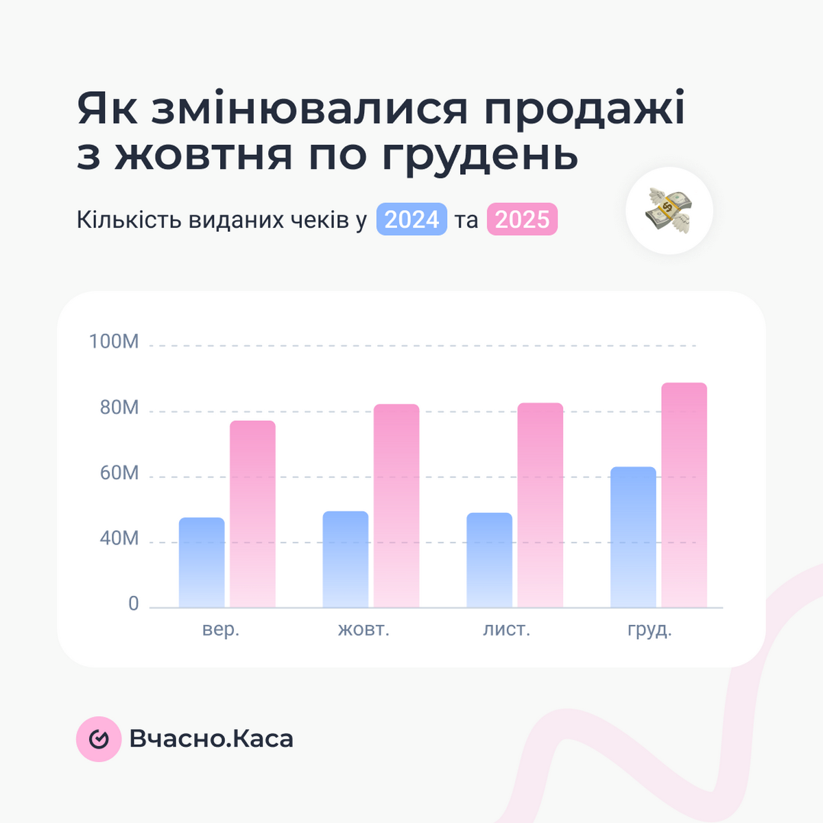 Чорна п’ятниця стає стартом розпродажів та підготовки до свят. Попри блекаути та складну ситуацію в країні, 75% українців планували різдвяний та новорічний шопінг, за даними Deloitte Ukraine. При цьому 18% покупок припадають на період до грудня. Цей тренд підтверджують і дані сервісу «Вчасно.Каса». Головна відмінність цього року — зменшення ефекту пікових «грудневих покупок»: якщо у 2024 році обсяг операцій у грудні зріс майже на 35%, то цього року зростання склало лише 12%.