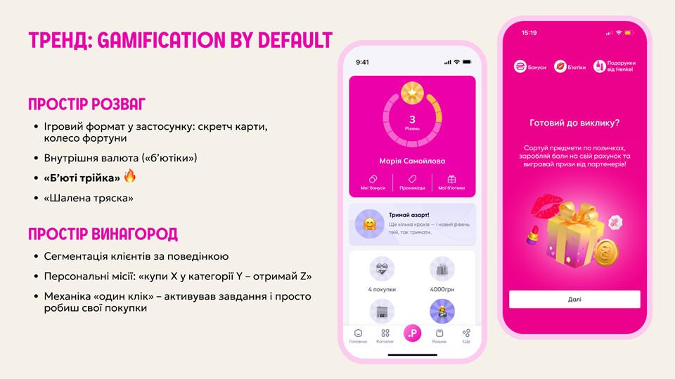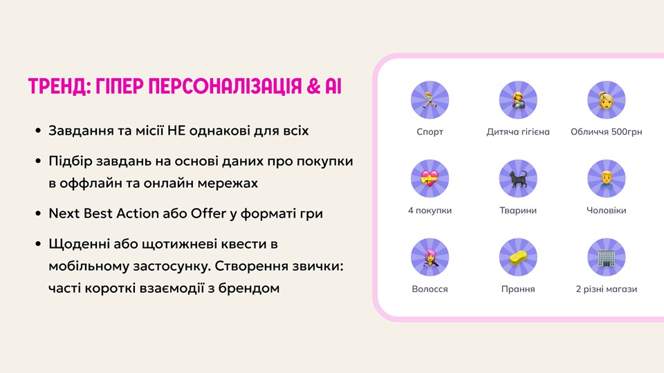 До прикладу, клієнт купив товари певної категорії, а ми спонукаємо попробувати нову категорію. Або ми бачимо, що клієнт купує офлайн, але поки не купуємо онлайн – ми даємо йому це завдання. Подібний формат виглядає максимально просто для клієнта: він бачить кожного місяця прості завдання, робить регулярні покупки, заробляє додаткові бонуси, «б’ютіки», або промокоди, які він відразу застосовує на нові покупки.