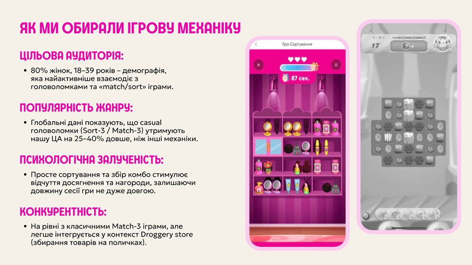 Єгор Павленко: Зважаючи, що основна аудиторія – це 80% жінок, віком 18-40 років, почали досліджувати ринок, щоб зрозуміти, а яка гра підійде саме для цієї вікової категорії. Обрали відому гру, де потрібно сортувати предмети, щоб розчистити місце.