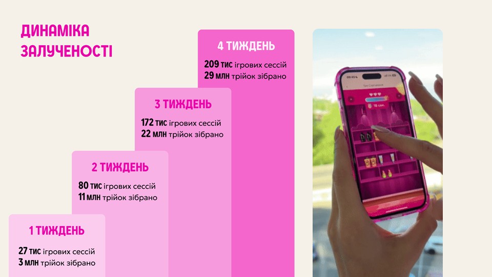 Після кожної сесії користувачі можуть натиснути на кнопку «Грати ще», і у нас таких натискань 21,5 мільйона за менше ніж за пів року, 28 мільйонів рівнів пройшли наші користувачі, що дало 136% продажів онлайні. Звичайно, це не тільки через гру, а й інші активності, які робить Prostor. Звісно, через гру користувачі частіше заходять в застосунок.