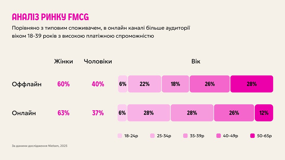 Перед тим як планували перезапуск програми лояльності, ми провели дослідження. На слайді видно, що онлайн-клієнт інший: має більшу платіжну спроможність та інший патерн поведінки.